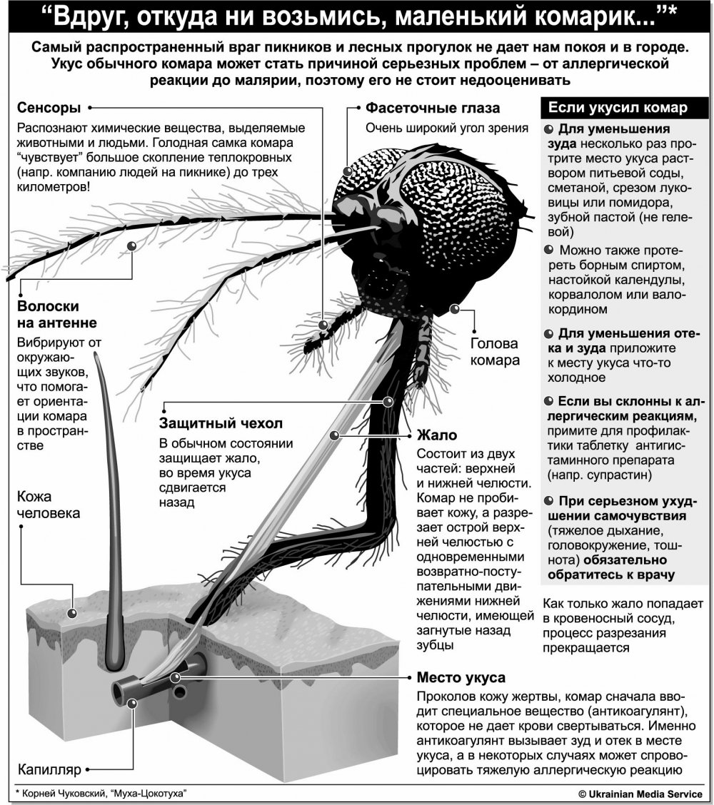 Жало комара, подобное игле шприца, защищено специальным защитным чехлом, который во время прокалывания кожи сдвигается назад. Прежде чем насекомое начинает сосать кровь, оно вводит под кожу антикоагулянт, который не позволяет свертываться крови: именно это вещество вызывает зуд, отек, покраснение на месте укуса, а в некоторых случаях и тяжелую аллергическую реакцию.
