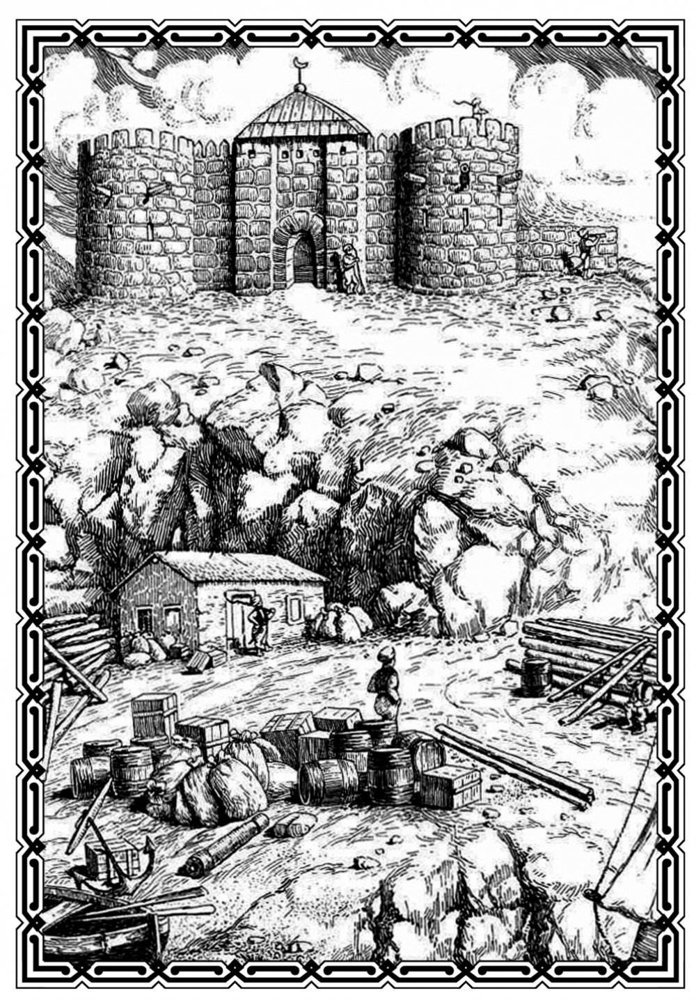 Что же представляла из себя Ени-Дунья? Крепость имела вид каменного четырёхугольника, окружённого земляным валом, внутри которого помещались дом турецкого паши и пороховой погреб. Но главной её достопримечательностью была башня с красным фонарём, т.е. гарем. Любимым развлечением паши в то время было зажигать красный фонарь на башне и ждать, пока на его зов, как бабочки на свет, не соберутся русские солдаты и украинские казаки. Сразу после этого поступал приказ подорвать пороховой погреб. Всё это паша проделывал неоднократно. Была одна неувязка — внутри гарема, как правило, расслаблялись турки, так что после каждого взрыва число защитников крепости просто таяло на глазах.