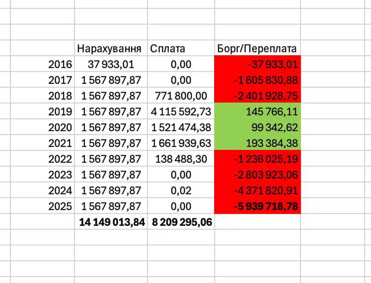 За восемь лет арендатор заплатил около 8,2 млн грн вместо более чем 12,5 млн грн по договору.