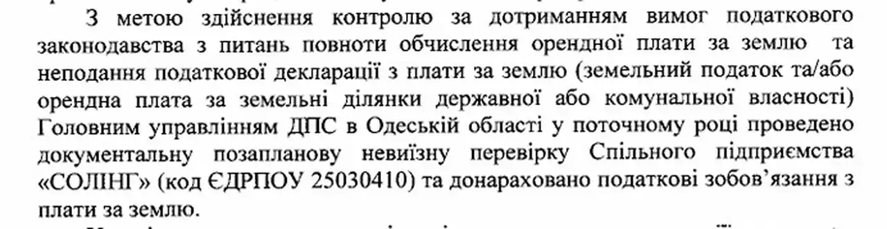 Согласно Налоговому кодексу, органы Государственной налоговой службы отвечают за контроль своевременности и полноты начисления арендной платы за землю. В мае 2025-го областная налоговая ответила активистам ОО «Зеленый лист», что долг «Солинга» по арендной плате составляет аж 25 копеек. То есть и Налоговая не заметила неуплаченных миллионов. Позже «Одесская жизнь» также обратилась в Налоговую с заявлением, в котором мы заново изложили все факты о договоре аренды, отсутствии изменений к нему и фактических платежах компании. На этот раз Налоговая ответила: «Принято на доработку». А впоследствии прислала редакции письмо, в котором признала наличие долга и отметила, что провела проверку и доначислила СП «Солинг» дополнительные средства.