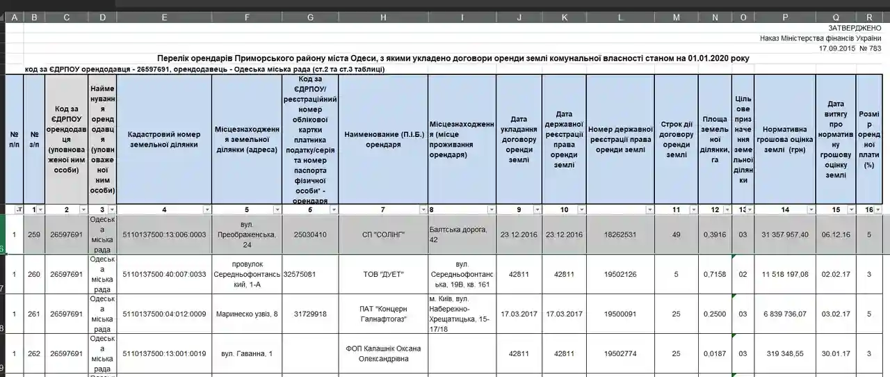 Информация о названии фирмы-арендатора, адресе участка, его нормативной денежной оценке на текущий момент и проценте арендной платы есть в открытых данных на сайте Одесского горсовета. Однако сколько фирма уплатила и имеет ли она долг по аренде — широкой публике неизвестно. Для проверки нужно иметь копию договора аренды со всеми изменениями и информацию о начисленных и уплаченных арендных платежах — все это граждане могут получить по запросу в горсовете.