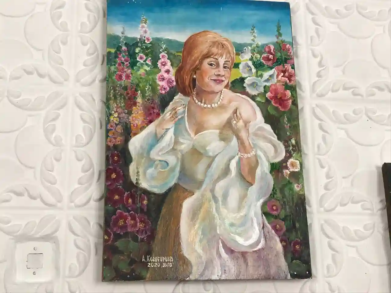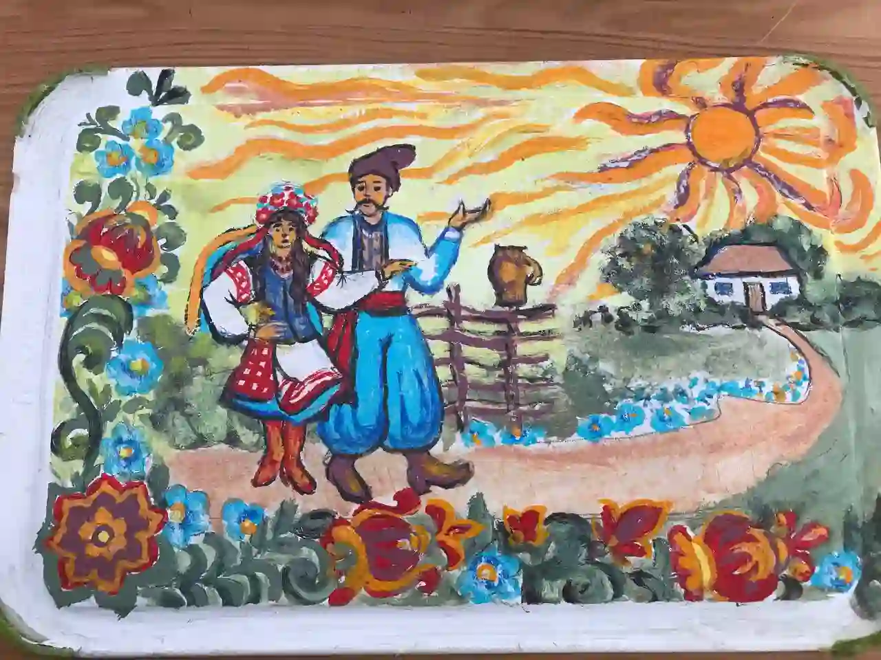 Эту веру женщина воплотила в картине «Украиночка», изобразив Украину в образе красивой женщины. На заднем плане полотна — пылающая реальность, а на переднем — голуби, подсолнухи, колосья пшеницы, васильки — символы мирной жизни.