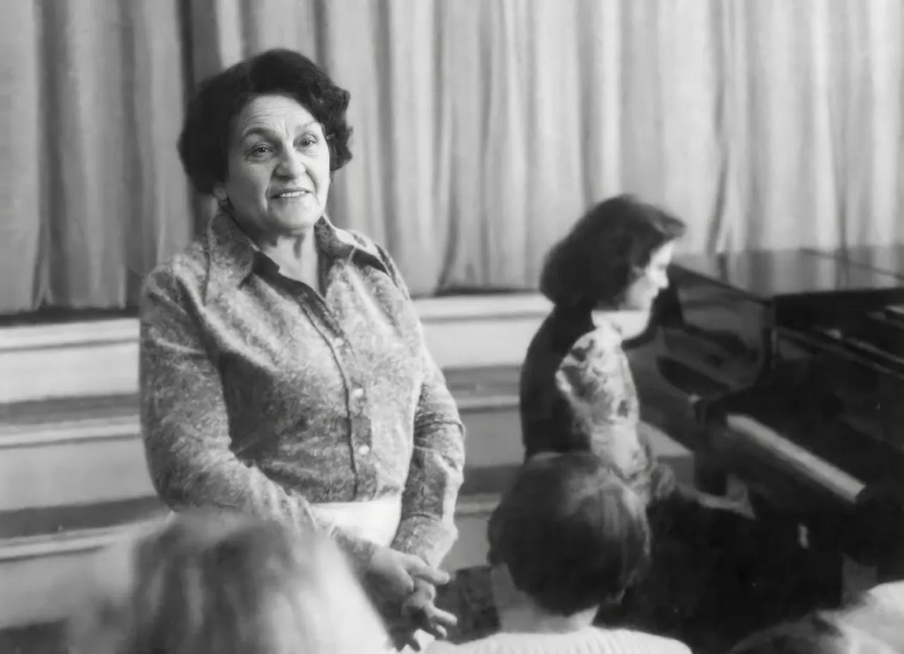 Людмила Гінзбург слухає ученицю (за роялем) на відкритому уроці