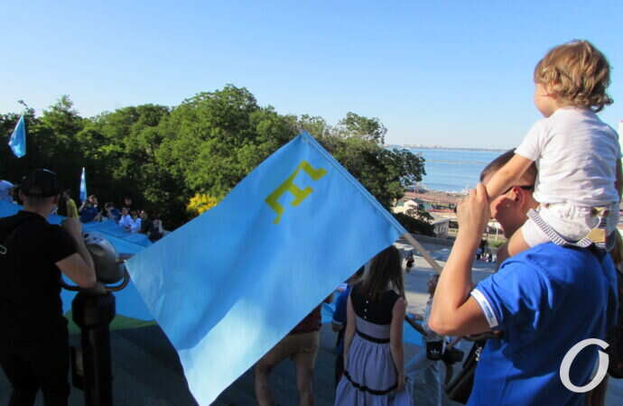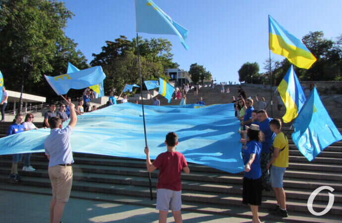Сегодня около 17:30 с Итальянского бульвара стартовала колона автомобилей общественной организации «Крымские татары Одессы». Спустя полчаса езды, они остановились возле Морского вокзала. Через установленные на автобус громкоговорители крымские татары включили народную музыку. Под такой аккомпанемент они стали разворачивать большой флаг и идти к Потемкинской лестнице.