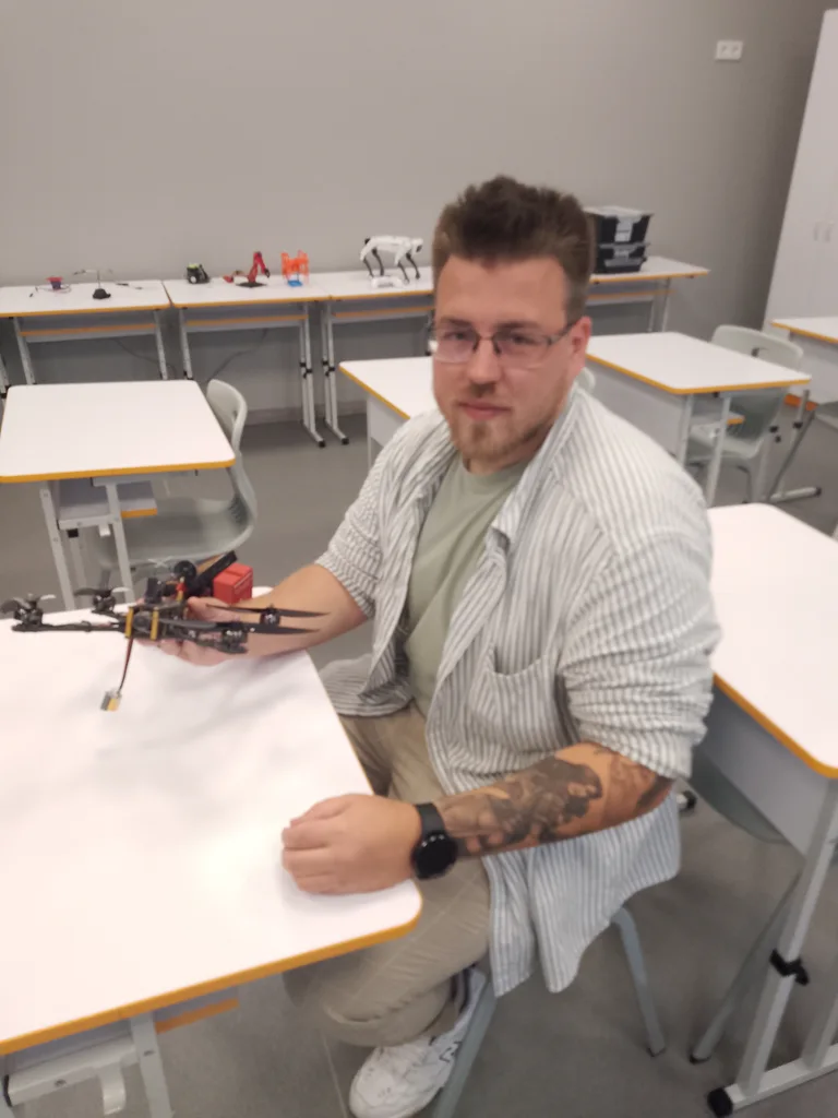 Преподаватель информатики Артём Романча попал в лицей совсем недавно. До этого он вёл кружок для ветеранов и детей ветеранов в коммунальном учреждении «Ветеран ХАБ». Обучал пилотированию дронов, программированию, а также работе с паяльником и другим инструментом.