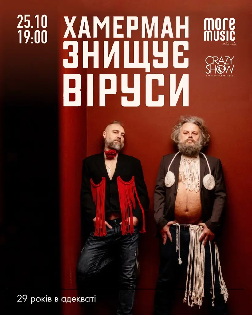 Есть группы, есть легенды, а есть Хамерман Уничтожает Вирусы — те, кто переворачивает представления о выступлениях. Их появление на «Червоной руте» в 1999 году стало взрывом, а карьера — сплошной чередой эпатажных экспериментов. Музыка? Есть. Театр? Еще какой! Костюмы? Ни разу не повторялись. Юмор? Острее лезвия. Они превратили перформанс в оружие — против обыденности, банальности и ленивого мышления.