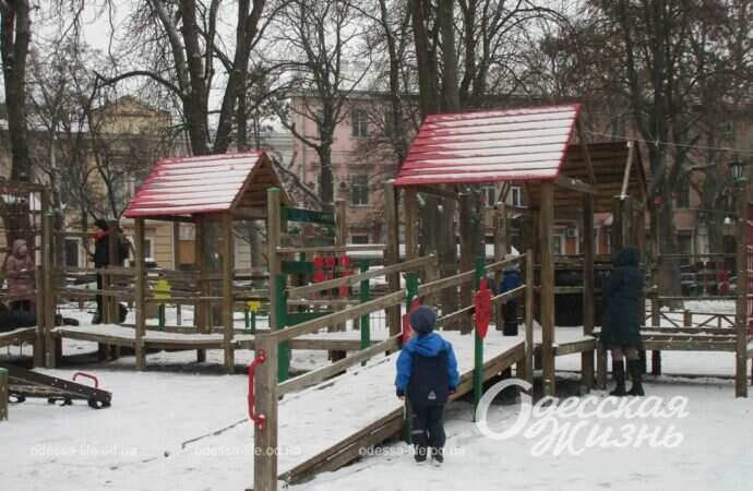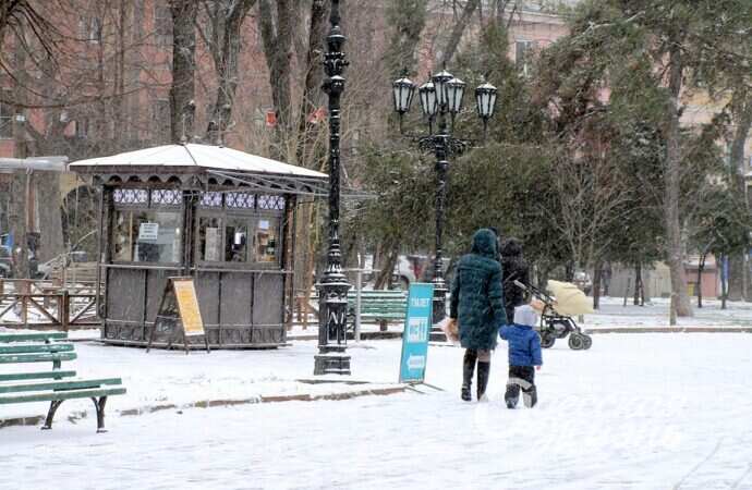 Дети в Горсаду выражают радость по поводу снежка, требуют от родителей приступить к лепке снеговиков, те же поясняют, что «не тот снег, да и мало его».