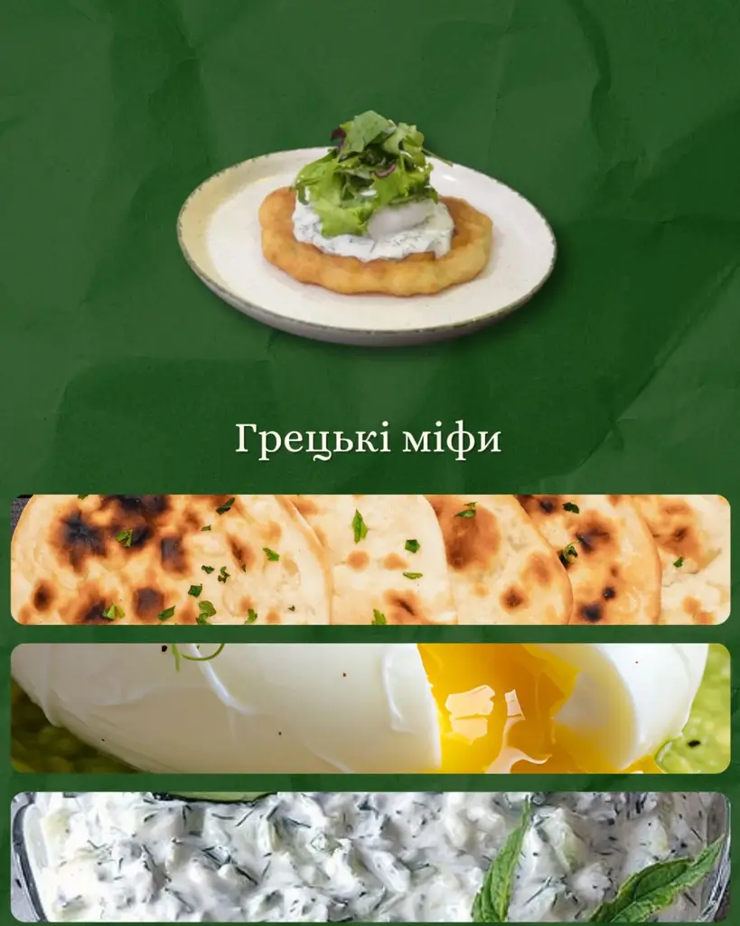 - Греческие мифы (флетбред*, яйцо, зелень, соус) — 200 грн