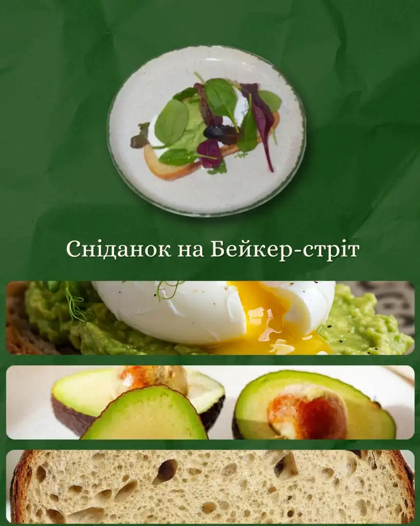 - Завтрак на Бейкер-стрит (тост, яйцо, авокадо) — 210 грн
