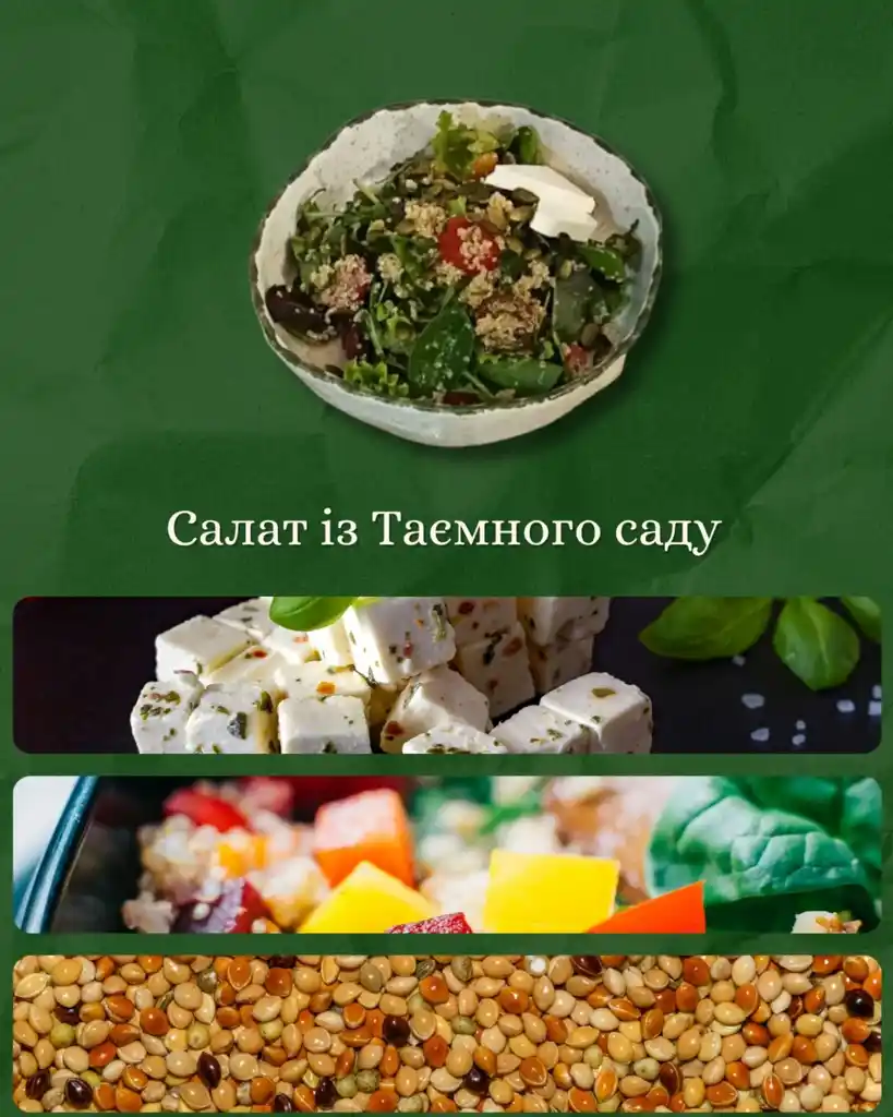 - Салат из Тайного сада (зелень, киноа, фета) — 260 грн