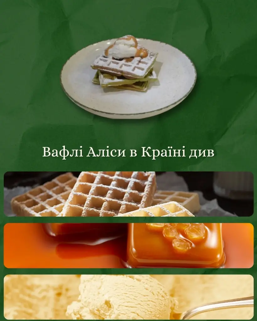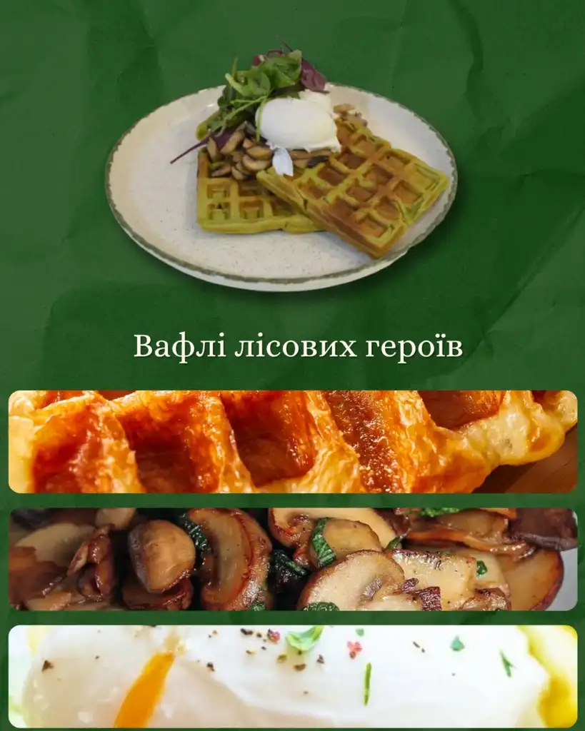 - Вафли лесных героев (вафли, грибы, яйцо, зелень) — 220 грн