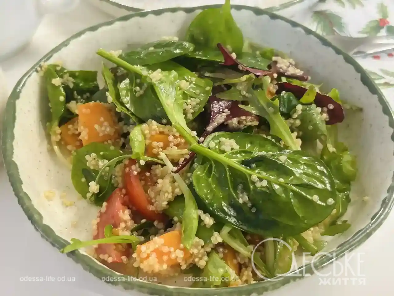 Блюда принесли сразу оба. Боул выглядел аппетитно — листья салата были свежими и не вялыми, а глубокая тарелка — полной. На вкус все тоже было гармонично: салат хрустел, киноа было рассыпчатым, а помидоры — сочными. Но по-настоящему меня удивил батат. Кажется, его кусочки почти не подвергались термической обработке. Это было неожиданно, но вкусно.
