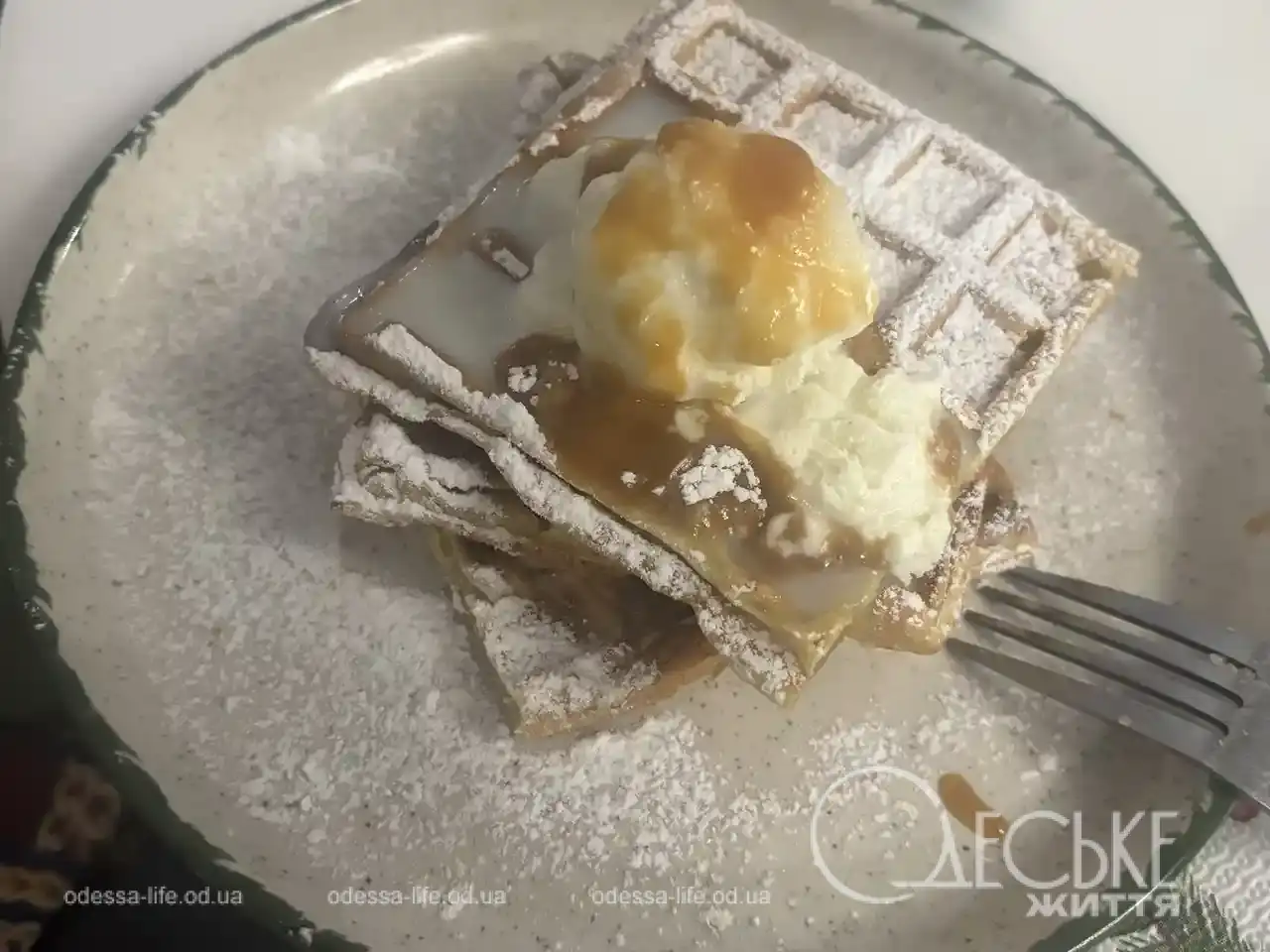 Что касается вафель, то, к сожалению, их вкус и текстура разочаровали, несмотря на сливочное мороженое, с которым их подают. Дело в том, что они получились слишком тугими. Во вкусе ощущался яичный оттенок.