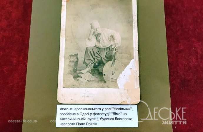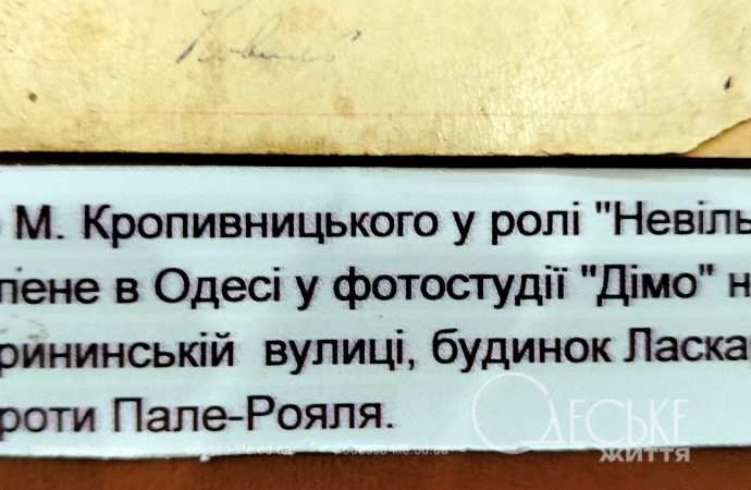 Позже держу в руках старинные фотографии, переворачиваю, читаю одесские адреса и фамилии фотомастеров. А это (все здесь раритет!) ― фотография самого Кропивницкого в роли в спектакле «Невольник». Фото сделано в одесской студии «Димо», которая располагалась напротив Пале-Рояля…