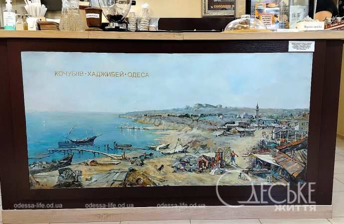 А вот картина, которую вы первой увидите в самом Музее ― из новых. Но ведь отражает старую-старую Одессу. Это копия картины Анатолия Кравченко «Кочубіїв-Хаджибей-Одеса», которую Петр Манелис приобрел для Музея во время аукциона на фестивале, проходившем в Литературном музее в мае этого года…