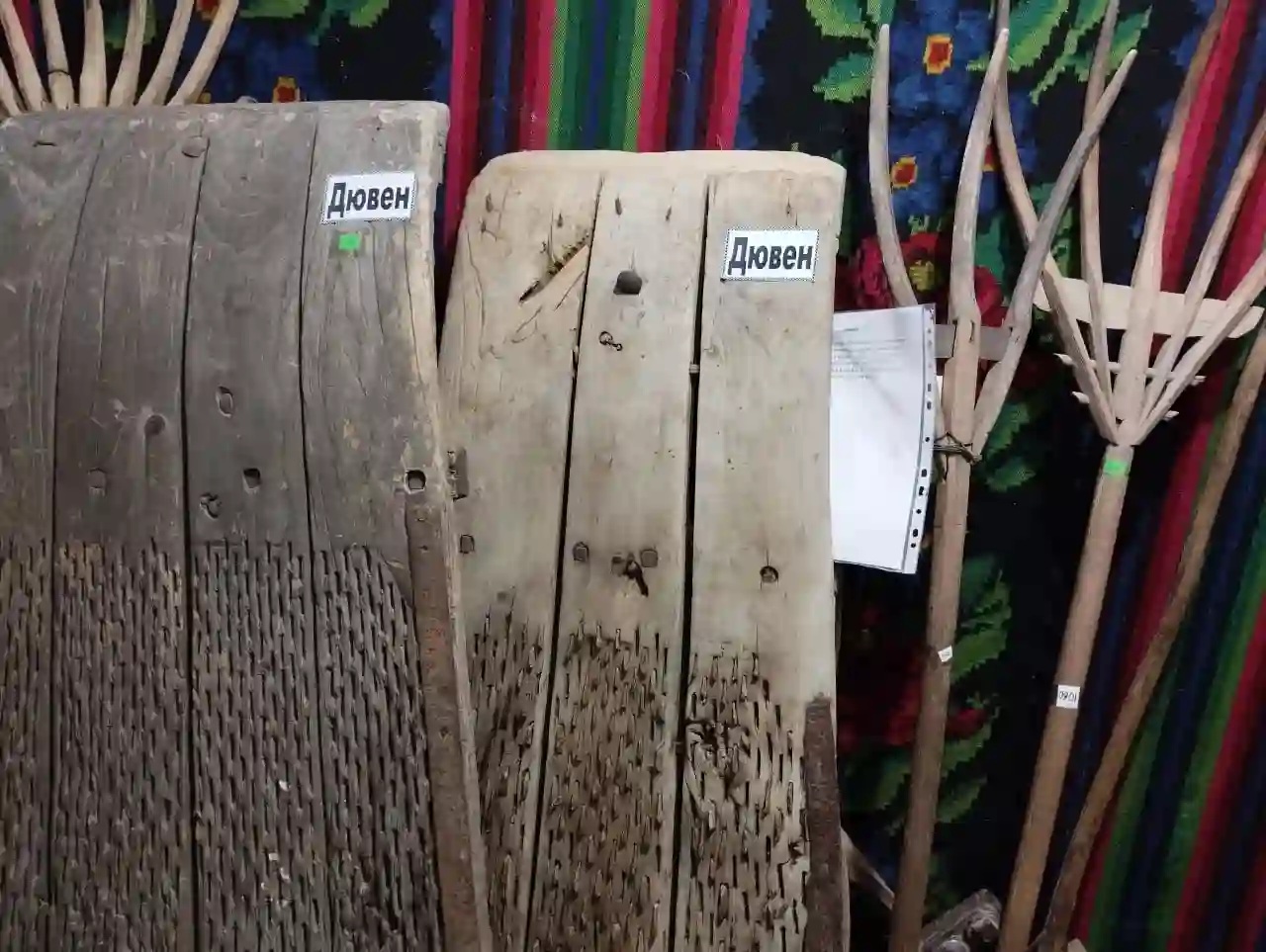 На трех больших деревянных устройствах, похожих на санки, таблички «Дювен». Только вместо полозьев у них — оскал из острых кремневых камней. Нина Дейнека включает функцию «видео».