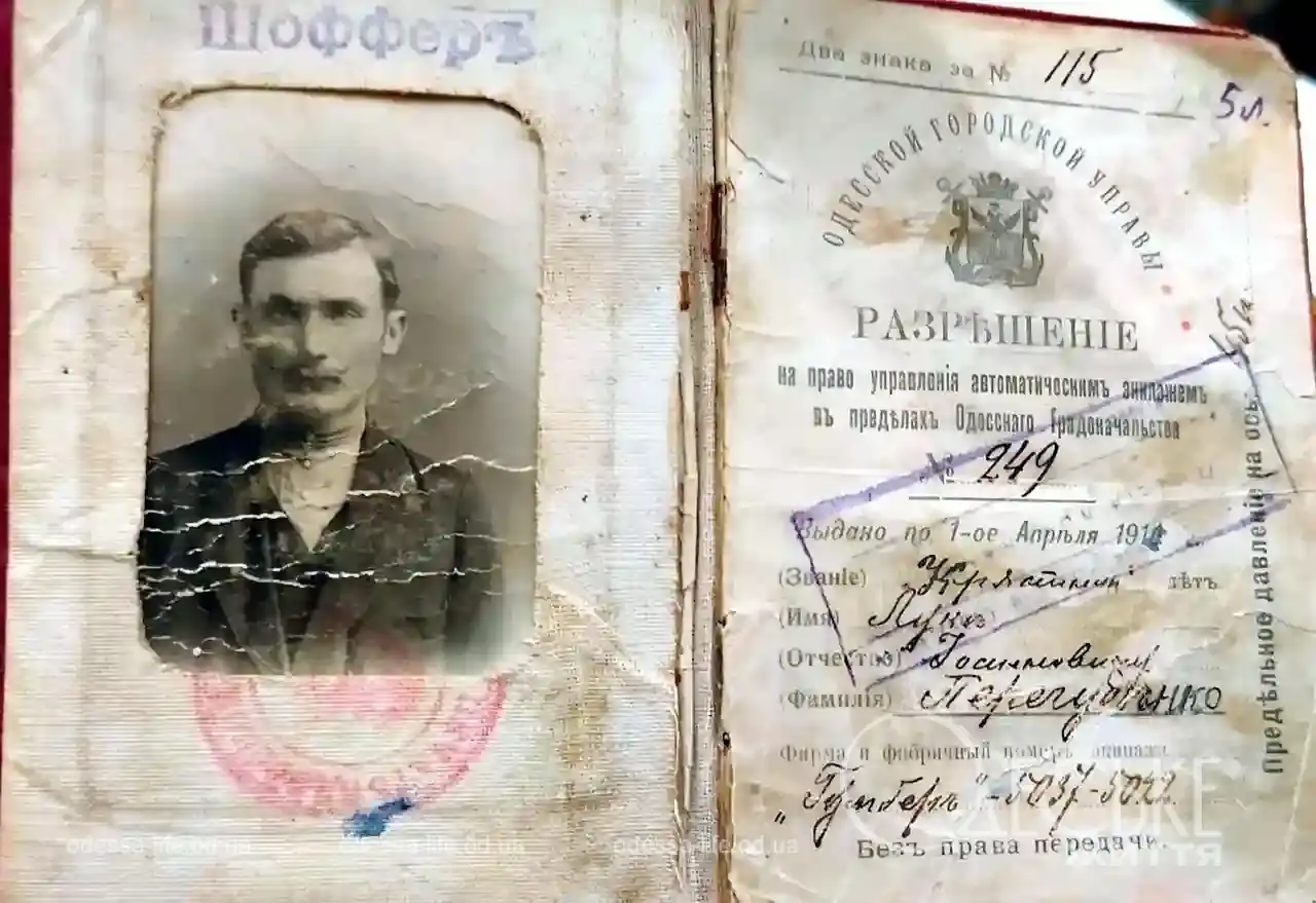 Среди документов — разрешение на право управления автоматическим экипажем (первые «водительские права» 1910 года), старинные справочники Одессы с описанием городских линий, газета «Одесское обозрение театров» с рекламой автомобилей и даже карточка подписчика «Одесского листка», издания самого Навроцкого.