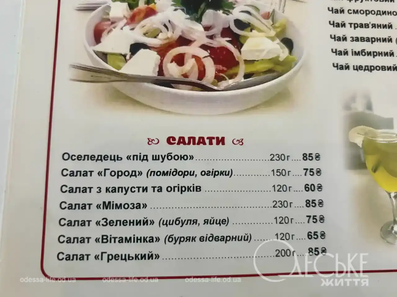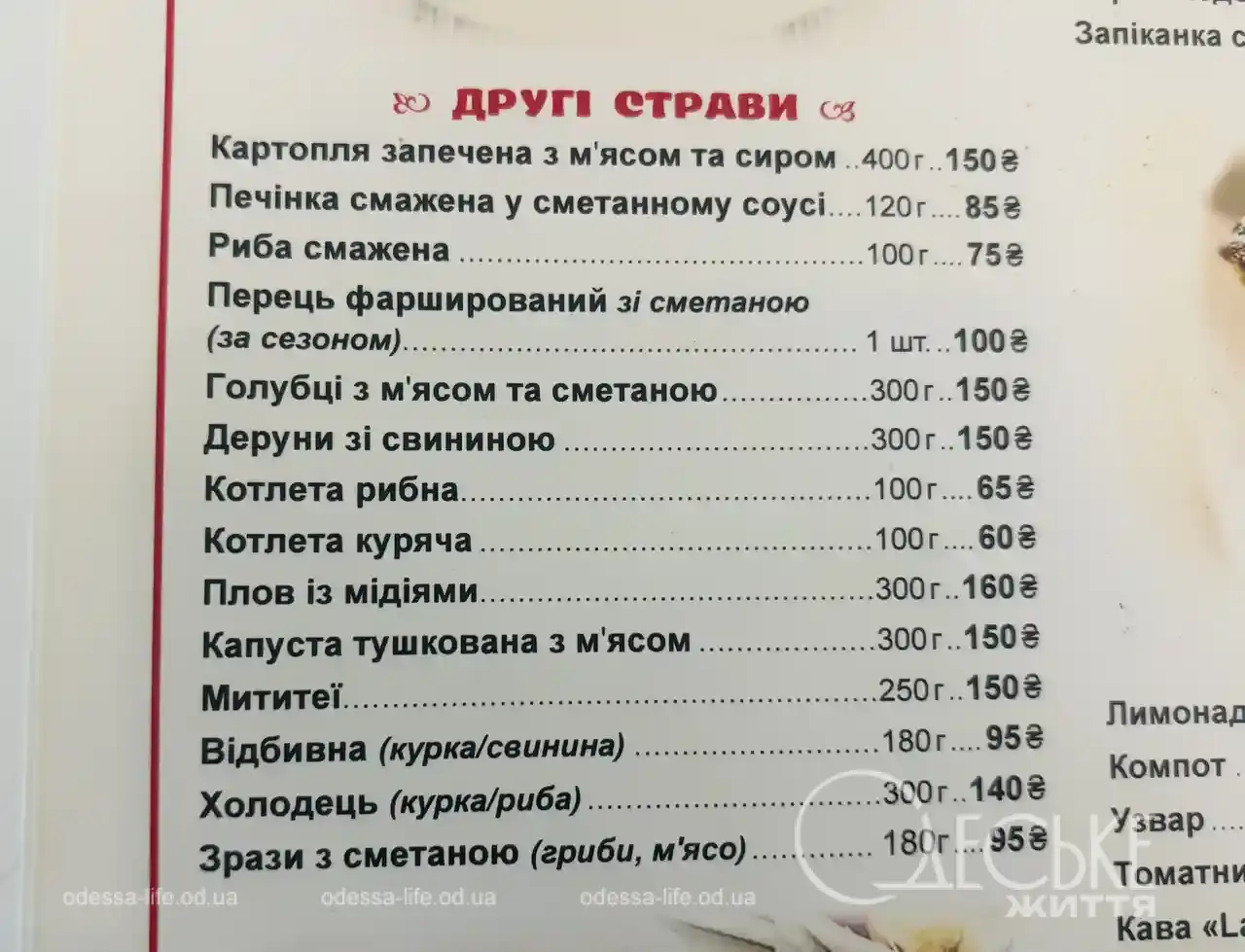 Среди предложенных блюд — фаршированные перцы, мититеи, пюре, холодец, селедка под шубой, жареная рыба, драники, первые блюда во главе с борщом, отбивные, салаты.