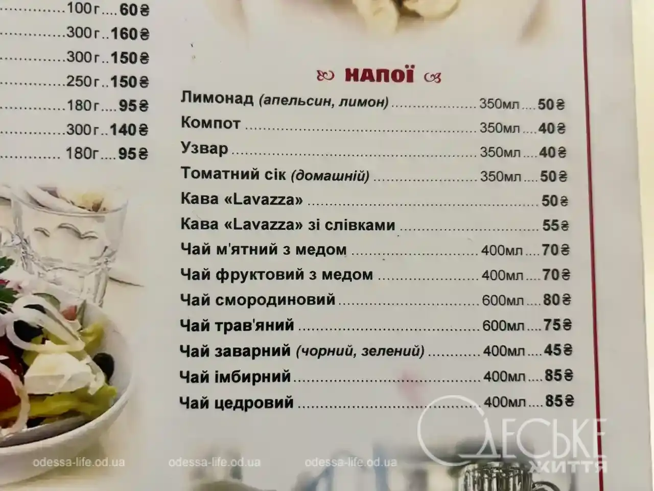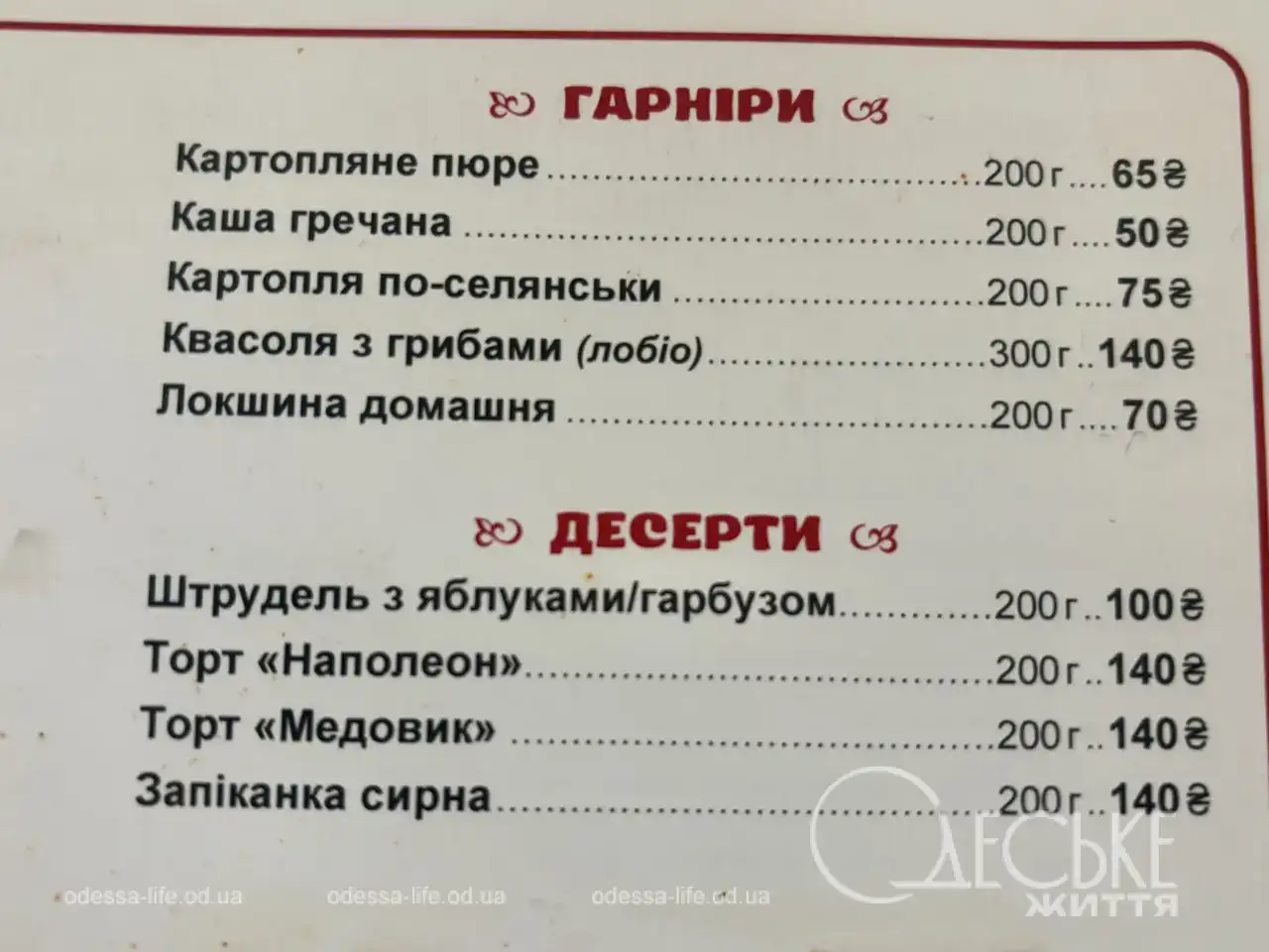 Порции большие: 500 г первых блюд и 300 г пельменей/вареников. Цены — от 150 до 190 грн за популярные позиции.