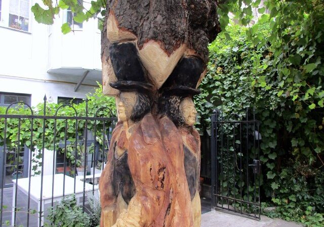 Переулок Маяковского вообще полон фишками-штучками. В одном из дворов имеется мурал, где товарищ Бендер тематически соединен с Михаилом Жванецким и всякими «одесскостями». В другом дворе из старого дерева вырезан сам Пушкин вместе с австрийским консулом.