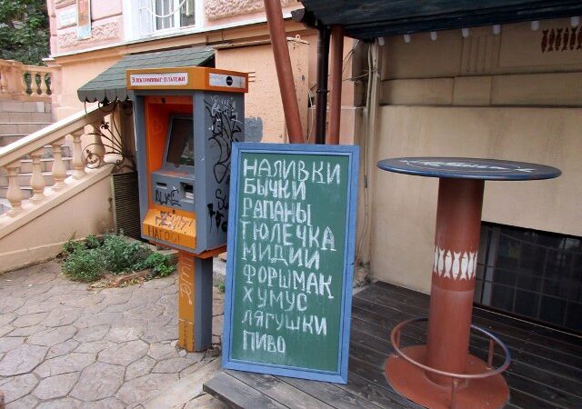 Имеется в переулке целый ряд кафешек – больших и малых. И каждое – со своим «лицом». Ну, вот даже крошечная кофейня предлагает вам к кофе на выбор добавки, зовущиеся «счастье», «любовь» и «удача». Ну а в перечисление блюд в другом кафе, ко всем уже известным бычкам-тюлечкам, добавляют и разнообразие в виде «лягушки» (почему не «лягушечки»?).