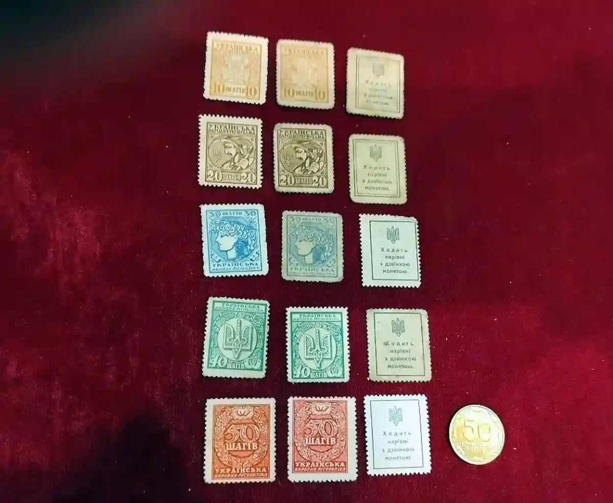 По его словам, в 1918 году украинская власть выпустила разменные бумажные знаки номиналом 10, 20, 30, 40 и 50 шагов. Из-за нехватки металла их печатали как марки — с перфорацией, пригодные для наклеивания на конверты.
