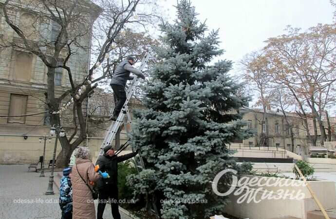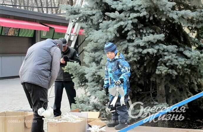 А вот в Летнем театре Горсада застали момент украшения елки игрушками. Эта елка — из удачливых во всех отношениях. И растет она здесь давно, и выглядит отлично, и шишки на ее верхушке похожи на нарядные игрушки. Над украшением красотки трудятся сразу несколько человек. И маленькому одесситу, который пришел с бабушкой подышать воздухом, повезло: принимает участие в важном и сказочном процессе.