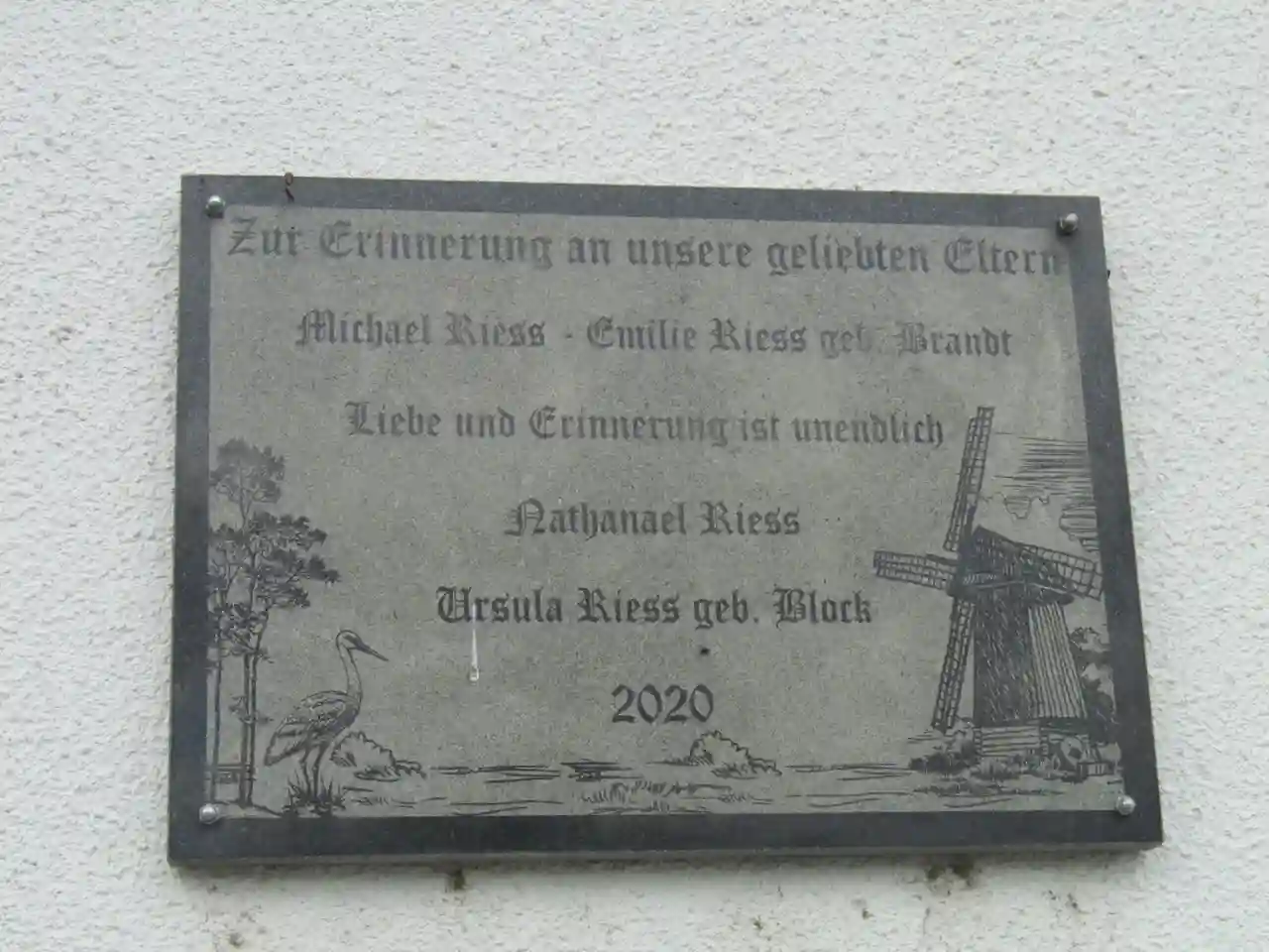 Надпись на табличке: На память о наших любимых родителях Майкл Рисс — Эмили Рисс, урождённая Брандт. Любовь и память бесконечны. От Натанаеля Рисса и Урсулы Рисса, урождённая БлокБеседка с колоколом в парке