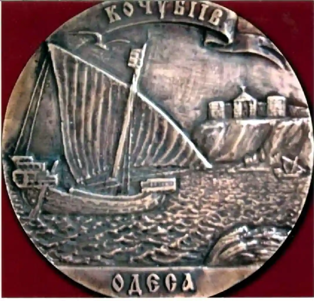 Медаль бронзовая, диаметр около 132 мм. На аверсе — надпись «Кочубеев, Одесса» по периметру и изображение чайки.