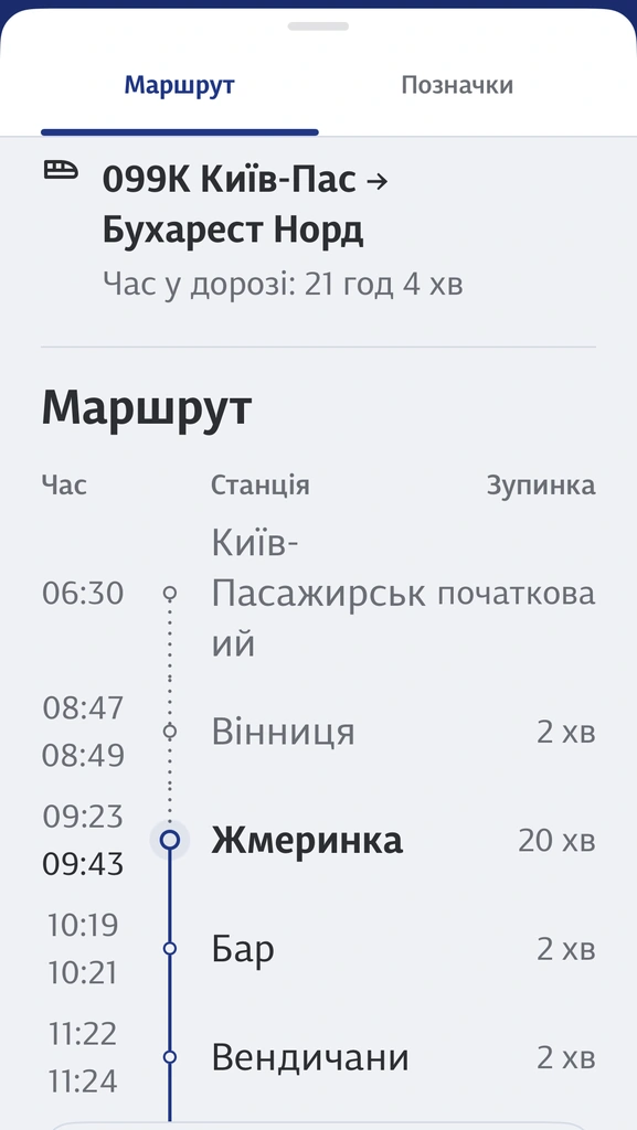 Поезд 99/100 «Киев – Бухарест» следует в Румынию через территорию Молдовы. В Украине он делает остановки в Виннице, Жмеринке и на станции Бар. С ноября поезду добавили еще три остановки в Молдове — на станциях Бельцы-Ораш, Окница, Унгены.