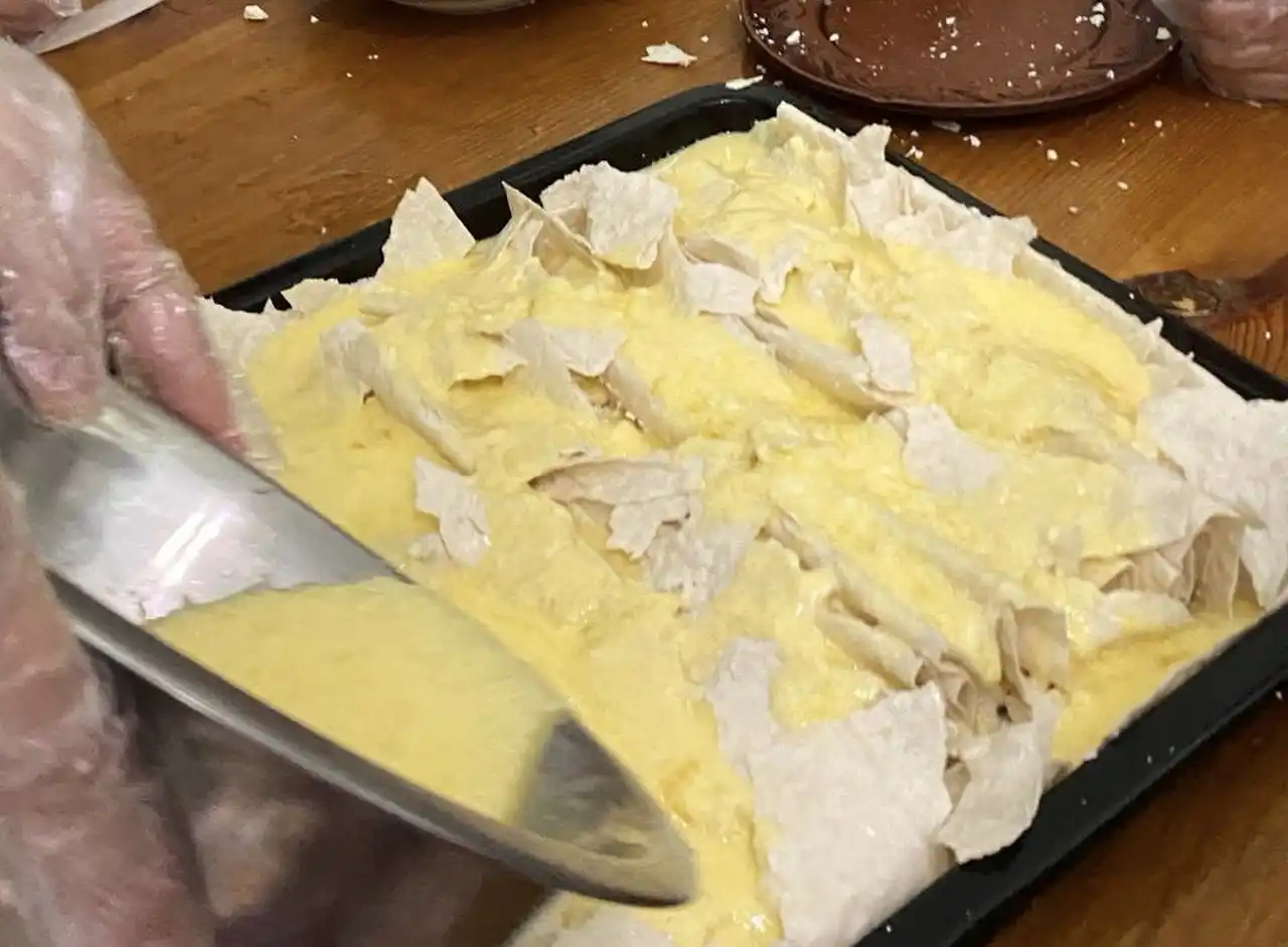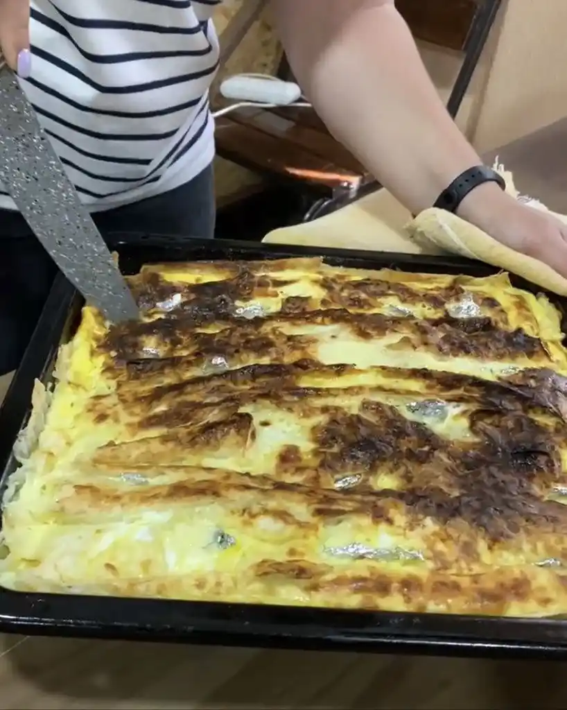 Далее все это собирается гармошкой, выкладывается в форму и заливается смесью из пяти яиц, взбитых с полулитром кислого молока. Именно в этом вторая тайна: для заливки Галина никогда не использует сметану или кефир — только кислое молоко. Если у меня нет кислого молока, я даже не берусь готовить милину, — говорит хозяйка.