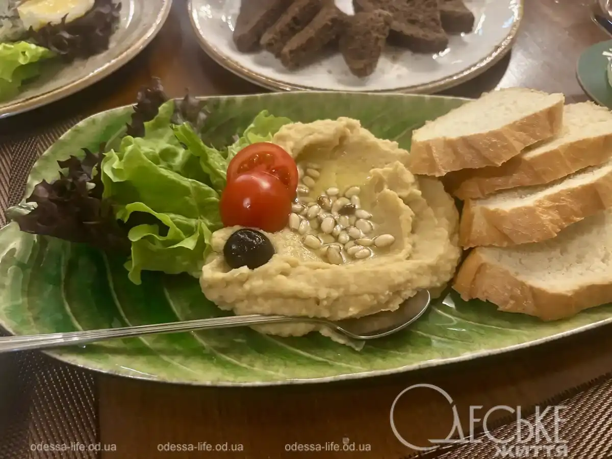 К хумусу подается белый хлеб (куски слишком толстые), а само блюдо посыпается кедровыми орешками, что придает ему изысканность, несмотря на простоту.