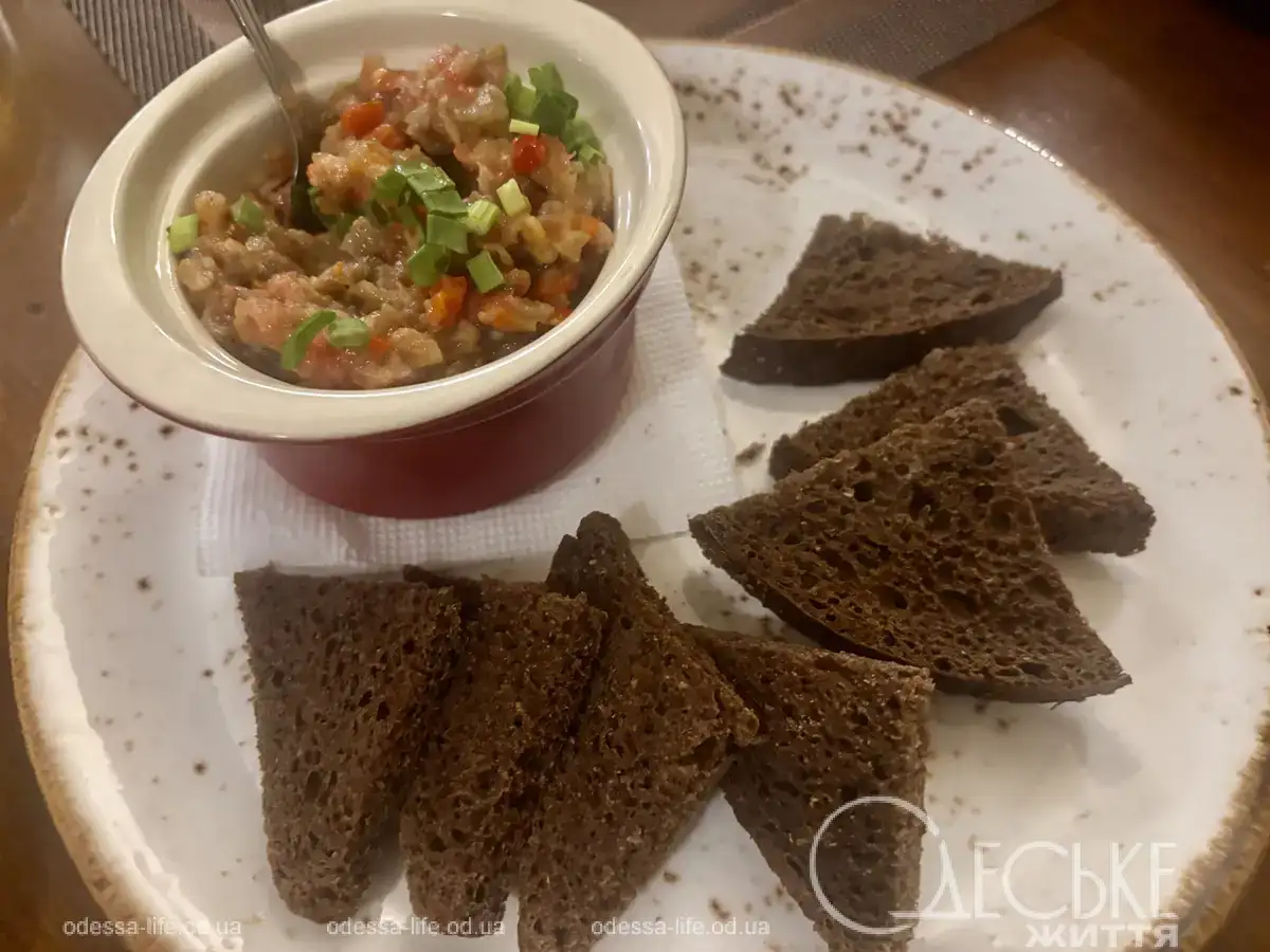 Закуски принесли довольно быстро. Подача блюд — достойная. К каждой закуске подаются тосты из черного хлеба.