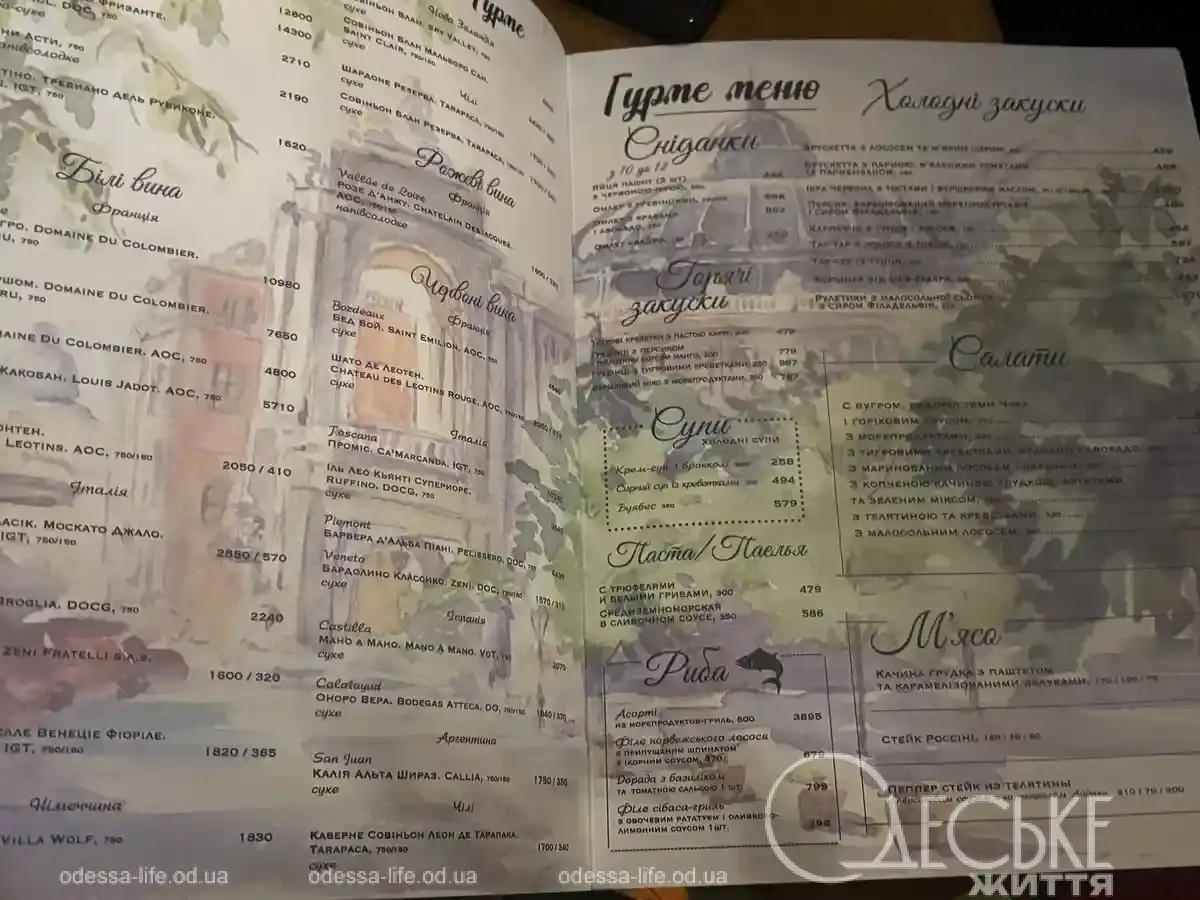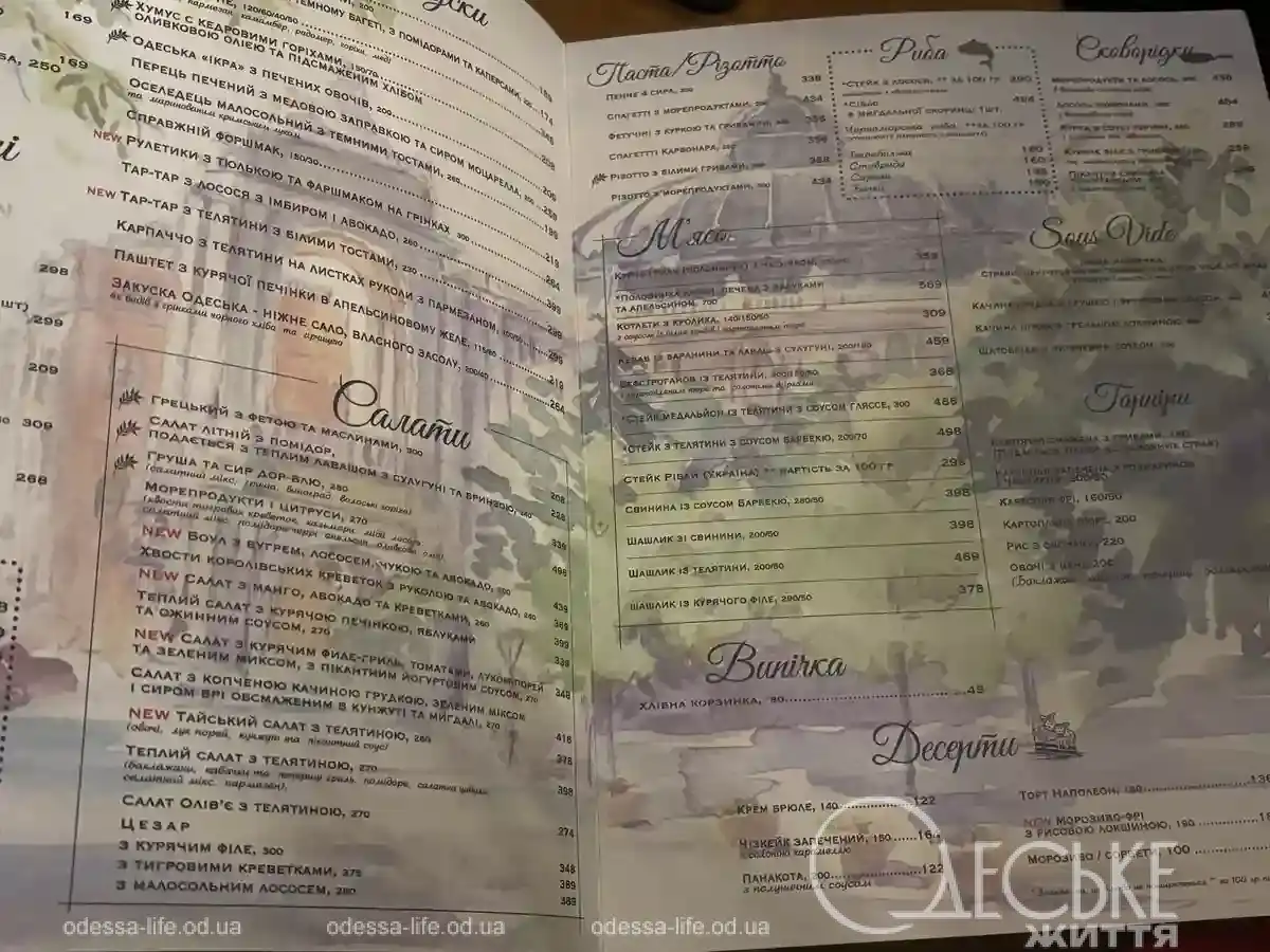 Меню заведения довольно объемное и состоит из блюд одесской и европейской кухни с вкраплениями самых популярных азиатских блюд. Здесь есть завтраки, холодные и горячие закуски, супы, салаты, горячие сковородки, мясо, десерты, ланчи и даже страница гурмана.