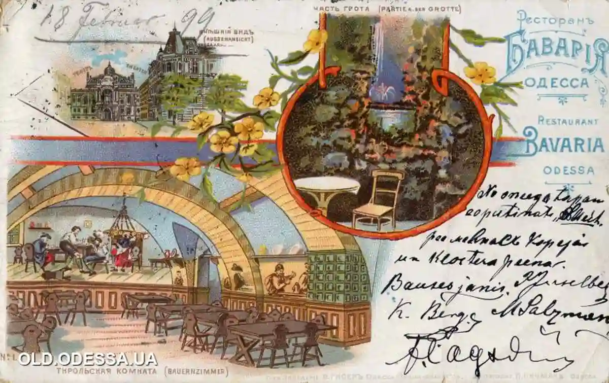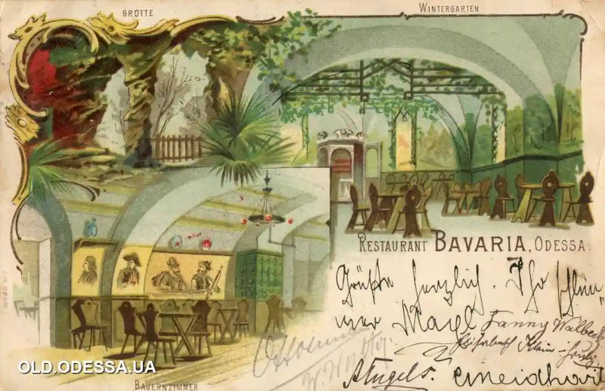 Именно здесь были найдены остатки росписи стен, которые существовали здесь с конца XIX века. Кстати, интерьеры старой «Баварии» можно рассмотреть на старинных открытках, большинство из которых есть в свободном доступе в интернете или в изданных альбомах одесских коллекционеров Анатолия Дроздовского и Евы Красновой.