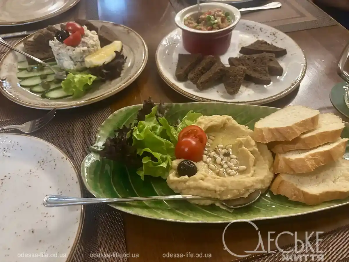Для знакомства с кухней Отона я заказал одесские закуски: форшмак (219), хумус (208) и икру из печеных овощей (209 грн) и котлеты из кролика, которые подаются с пюре (309 грн), ну и «Наполеон» (136 грн), как же без него.