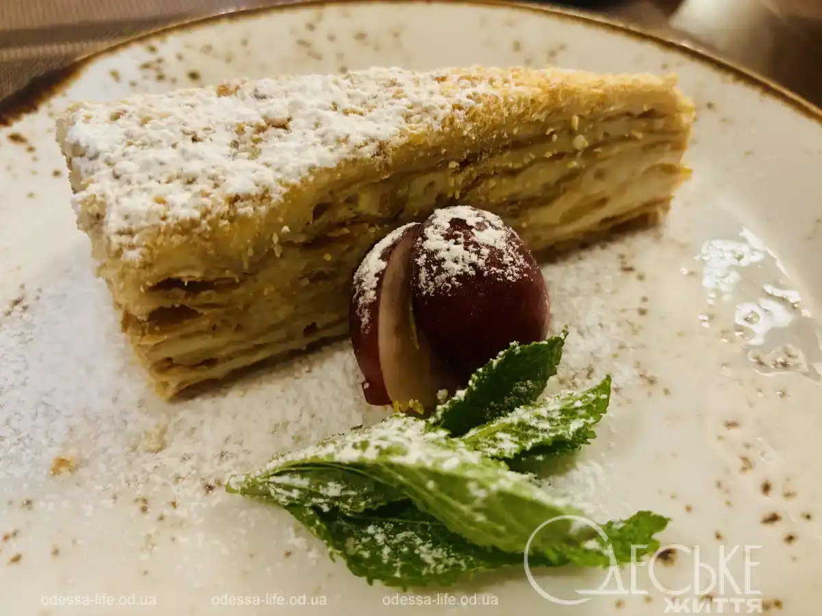 «Наполеон». Еще одна одесская классика. Мы не раз писали о разных вариантах этого десерта. В этом ресторане он плотный, влажный и не слишком сладкий. Но крем, как по мне, был немного водянистым — не хватило фирменной сливочности во вкусе. Где-то на восемь из десяти.