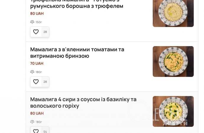 Меню Мамалыги составлял бренд шеф из Молдовы вместе с одесскими коллегами. Оно получилось достаточно большим. Общее количество позиций – 58! Здесь можно найти блюда из речной рыбы, всех видов мяса, в том числе утки и кролика, много овощных блюд, по несколько вариаций популярных блюд: семь видов вертуты, шесть вкусов мамалыги и пять видов плацинды.