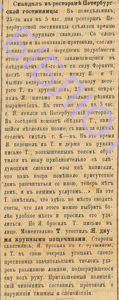 Корреспондент описывает потасовку: «Я. бросил Т. письмо в лицо. Моментально Т. угостил Я. двумя большими пощечинами. Стороны схватились; Я. бросил в Т. бутылкой, а Т. в свою очередь угостил своего противника значительным количеством ударов разливной ложкой, что подвернулась ему под руку. Приглашенный полицейский чиновник составил протокол о нарушении тишины и покоя».