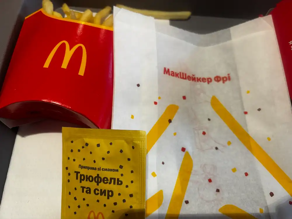 МакШейкер Фри со вкусом сыра и трюфеля (102 грн). Чтобы насладиться картофелем фри, нужно немного «поиграть». Вам выдают пакет, в который нужно засыпать картошку и специальную посыпку (она есть двух видов) и хорошо потрясти, чтобы все это перемешалось. Честно говоря, эта посыпка не поразила. Ее вкус напоминает посыпку на попкорне, который любит есть моя внучка, когда мы ходим в кино. Я такие добавки уже не употребляю. К картофелю рекомендую взять еще соус, который я почему-то не заказал сразу, а дозаказывать не хотелось.