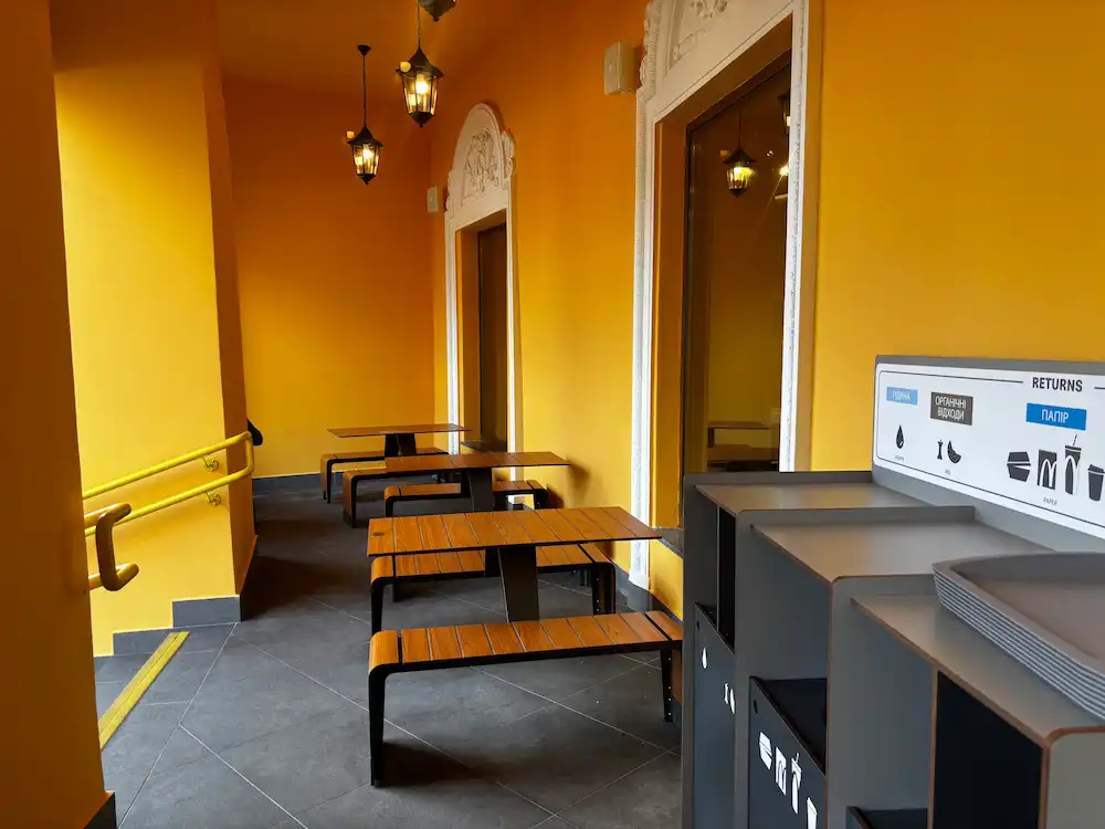 Давайте заглянем внутрь полуциркульного здания. Здесь все гораздо проще. К сожалению, из-за смены десятков хозяев и организаций бывшие интерьеры не сохранились. Теперь здесь современный дизайн – сочетание теплого дерева, цветного стекла и серого цвета. В средней, достаточно узкой части стоят терминалы самообслуживания, столики на двоих, туалет и отдельно умывальник. Слева – кассы, а справа – зал со столиками. Также там стоят стулья для самых маленьких посетителей, еще одна уборная, в том числе для людей на креслах колесных.