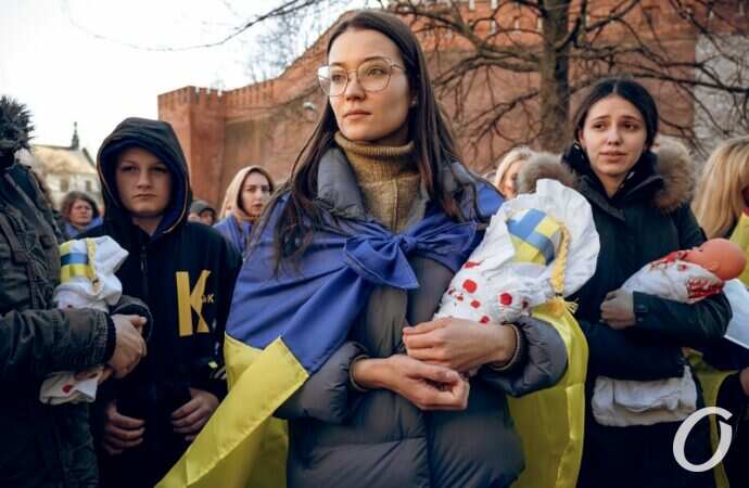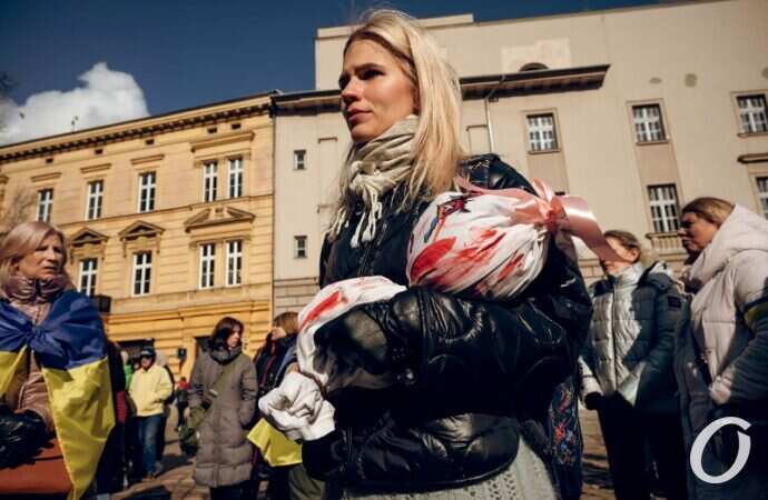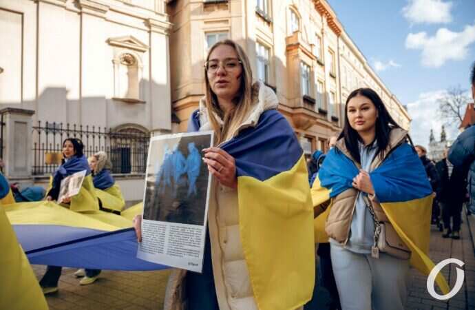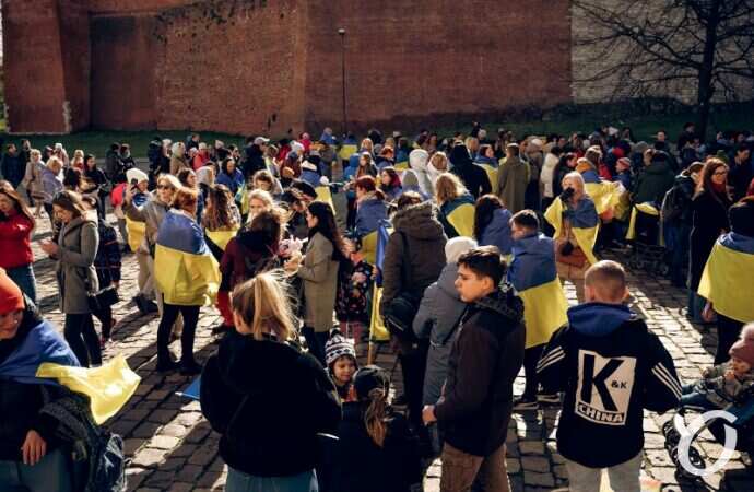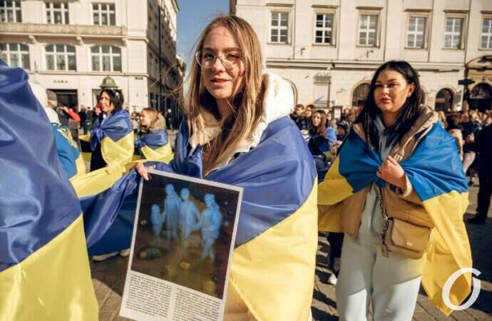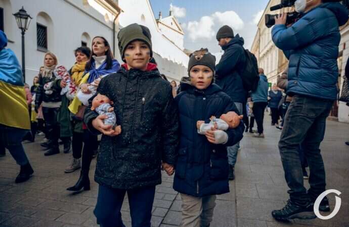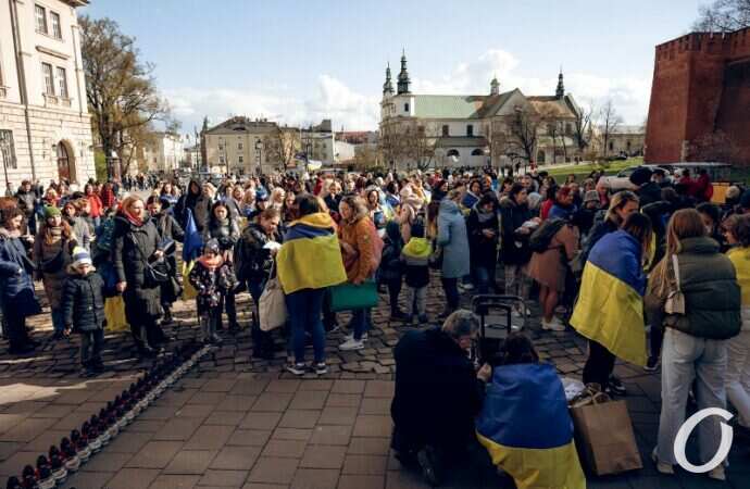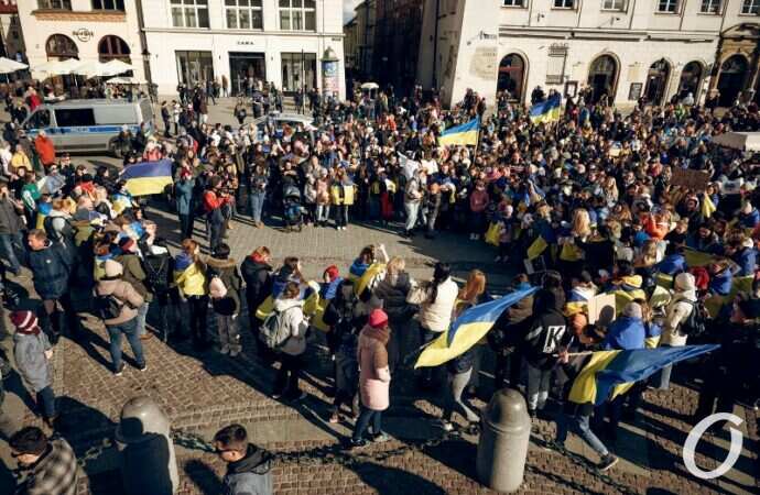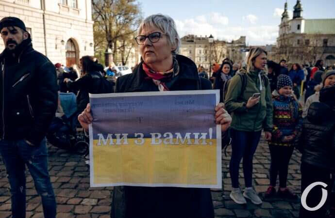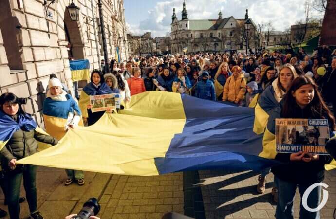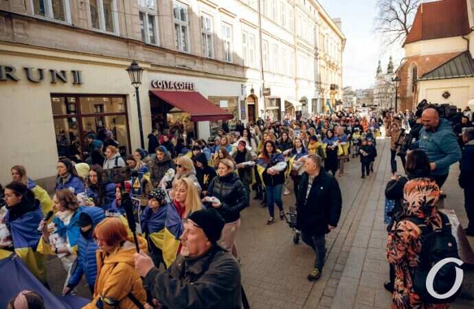 На плакате одной девочки с сине-желтым флагом на плечах было написано: «Я хочу домой к папе!». И вполне можно представить, что все участники акции с удовольствием приехали бы в весенний Краков на чашку кофе и купили бы детям традиционный краковский бублик. Но сегодня они здесь не по своей воле. Сегодня они идут по улицам Кракова, чтобы мир не закрывал глаза на войну в Украине. Они идут по улицам Кракова, но мысленно в сожженных, разрушенных и разграбленных городах Украины. Они идут по улицам Кракова, но сердцем со своими мужьями, братьями, сыновьями, отцами, которые отважно защищают Украину. Они идут по улицам Кракова и оплакивают всех невинно убитых детей и их родителей. Они идут по улицам Кракова…
