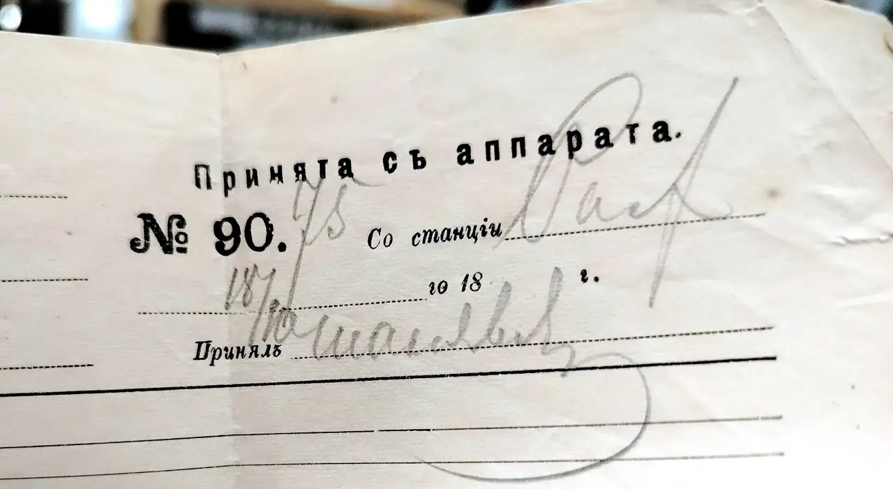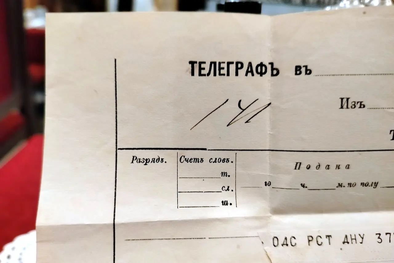Перед нами — настоящая телеграмма XIX века. Желтоватый листок бумаги, едва заметные следы старого клея и текст, написанный характерным «телеграфным» стилем…