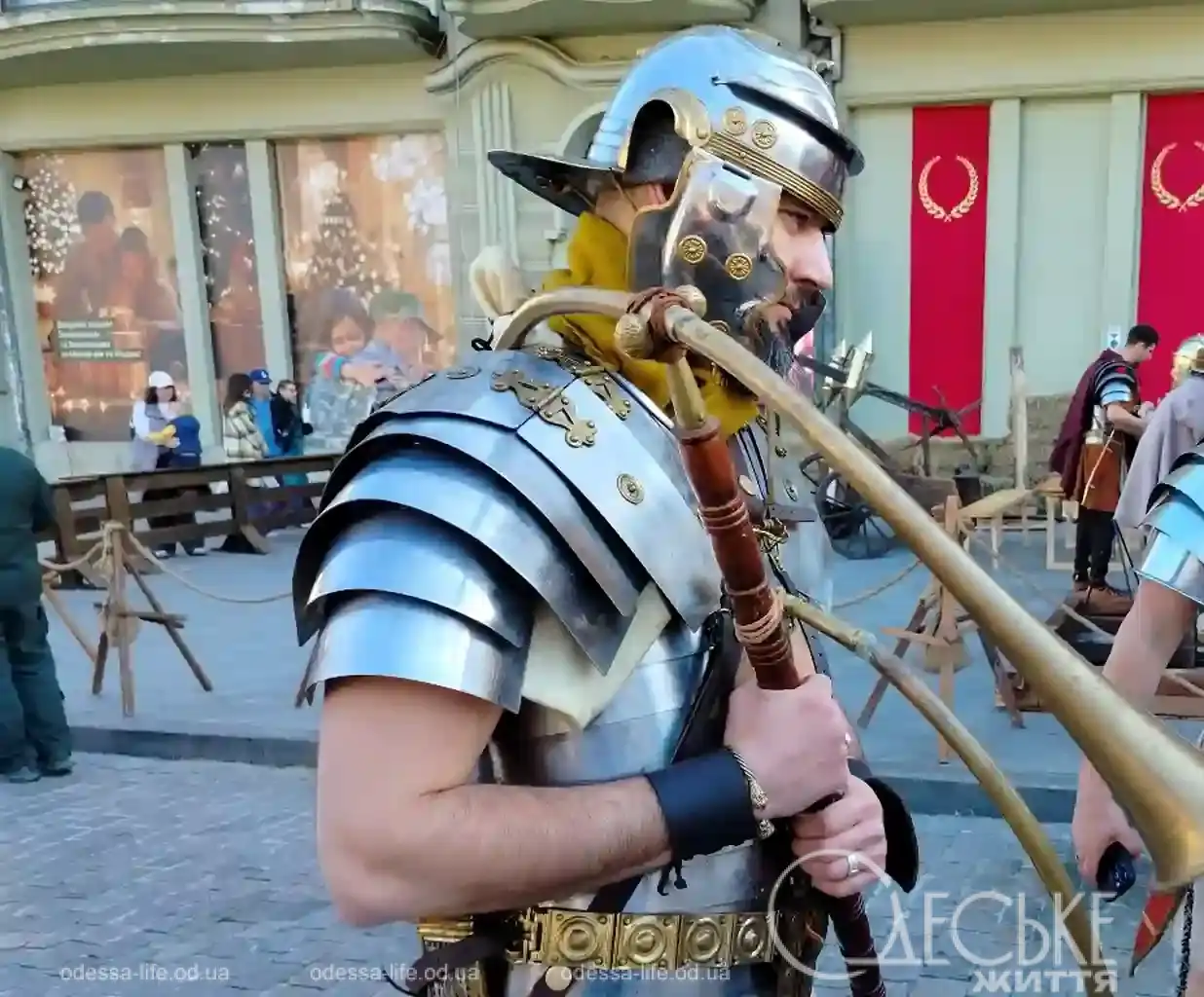 Но вдруг в этот мягкий праздничный поток врывается другая эпоха. Четкий шаг. Металлический блеск. Ровный строй. На Дерибасовской появляются римские легионеры.