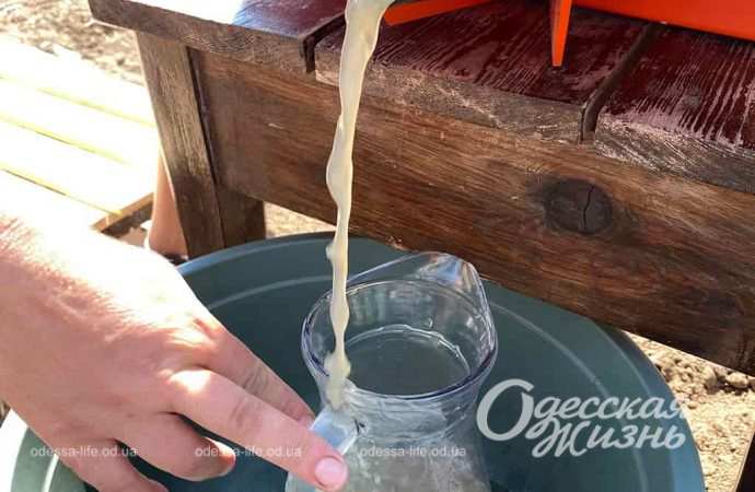 Сусло – только что выжатый сок, попадает в графин. Мы разливаем его в бокалы и пробуем на месте. Это невероятный эликсир с мякотью и приятным сладким вкусом. Бокал такого сусла – витаминная питательная бомба, заряжающая организм силой и здоровьем.