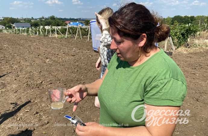 Марина Федоренко, кандидат сельхоз наук объясняет и демонстрирует, как происходит подсчет времени начала сбора. Это происходит с помощью специального прибора, на поверхность которого капают сок спелой ягоды и мгновенно получают показатель содержания сахара. Если эта цифра достигает определенных показателей (в нашем случае это 18%), сбор нужно начинать как можно быстрее. До недавнего времени к сбору подключали многие сезонные рабочие, последние несколько лет их количество значительно сокращено, поэтому на виноградники выходят все сотрудники, независимо от регалий.