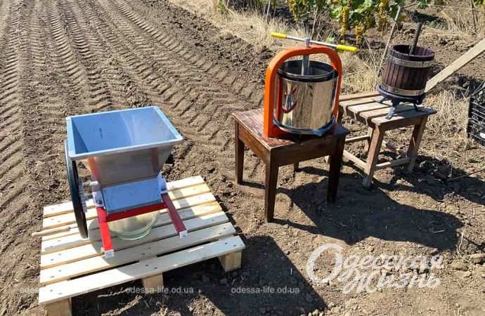 Виноград вместе с гребнями вручную извращается через дробилку. Далее, полученная мезга отправляется в пресс. Для работы был выбран более современный пресс.