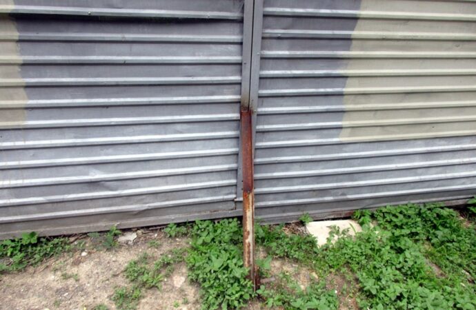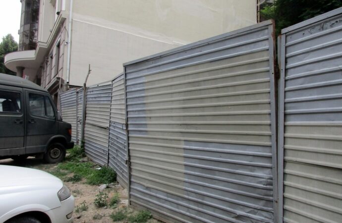Побывали на Военном спуске. За высоким забором — тишина. Ограждение металлическое, все заперто на замок, забор, правда, опасно шатается — со времени его установки прошло немало времени. Правда, уже появились подпорки для его «устойчивости». Сразу хочу предупредить — не подходите близко.