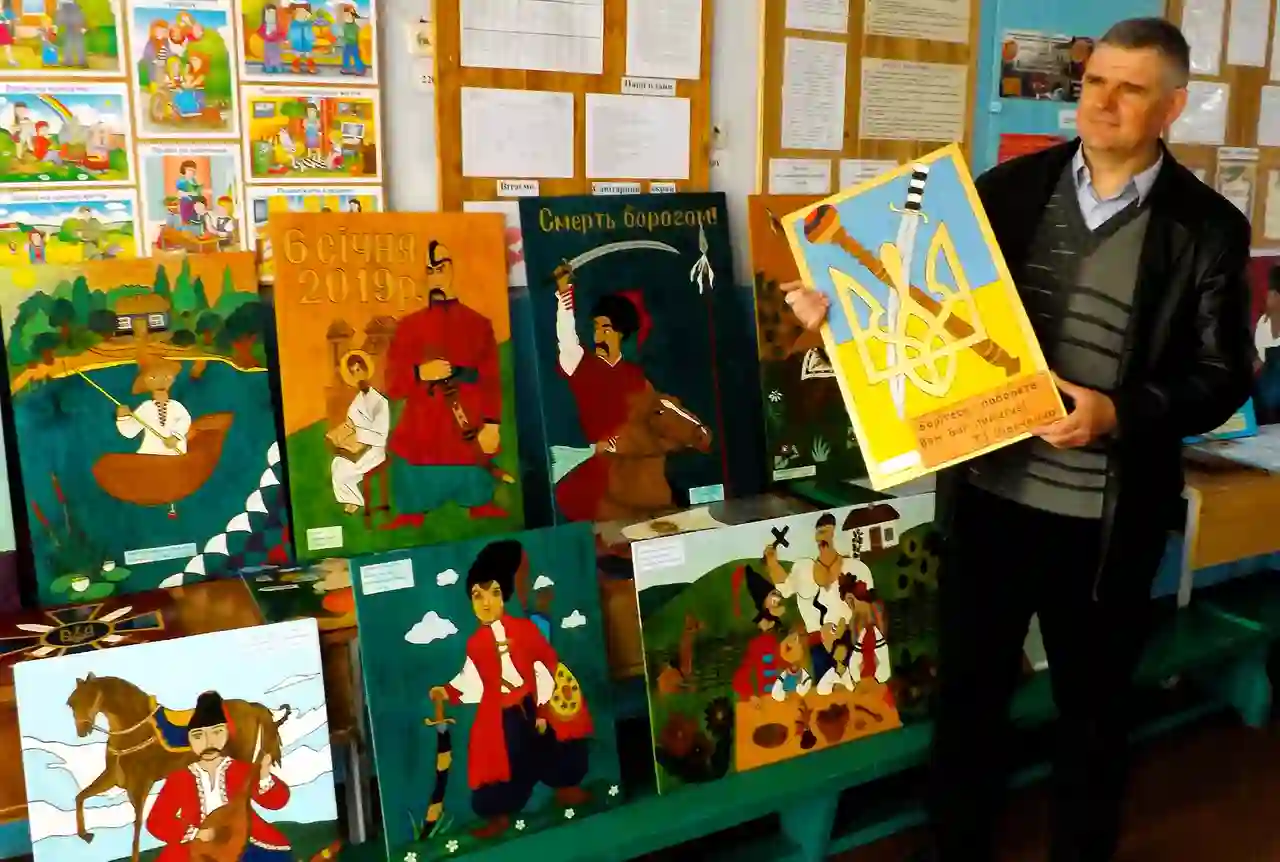 Фойе школы украшают работы из дерева школьников и педагога. Часть он подарил в музей Олейника. Если найдется помещение, то учитель-краевед хочет устроить выставку детских работ, собственной коллекции древностей с экспонатами новейшей истории Левадовки.