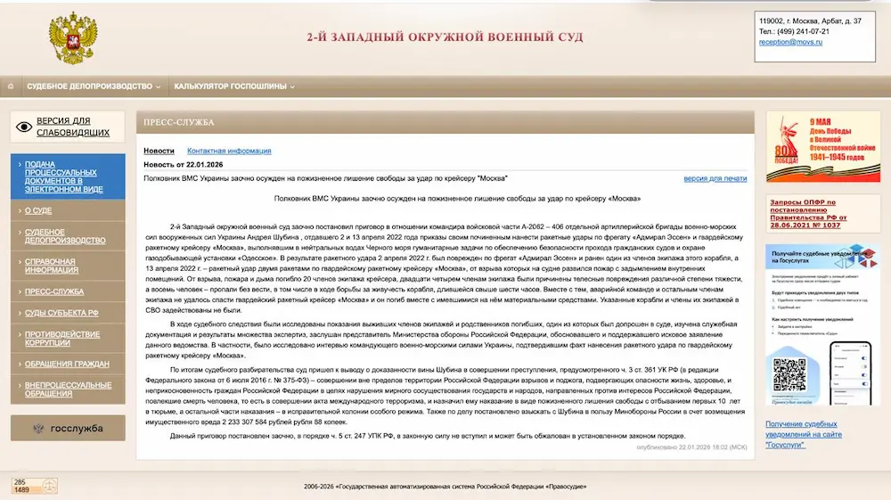 Второй Западный окружной военный суд в Москве заочно приговорил командира 406-й артиллерийской бригады ВМС Украины к пожизненному заключению за потопление ракетного крейсера «Москва». Об этом сообщило издание «Милитарный» со ссылкой на публикацию суда, которая позже была удалена.
